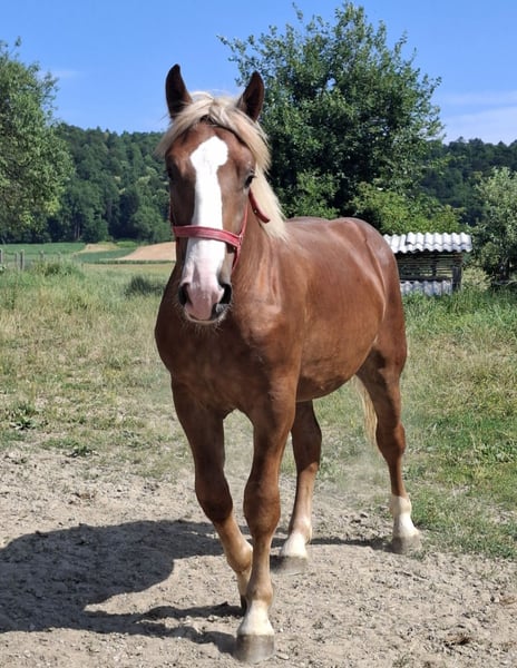 For sale is a promising 1-year-old Noriker gelding with excellent potential for work or leisure. This young gelding impresses not only with his calm temperament and clear character but also with correct conformation and a solid foundation. He is currently 1.56 meters tall and weighs 600 kg, with an expected final height of approximately 1.65 meters. He is halter-trained, familiar with daily handling, and initially a bit shy in new situations, but always curious and eager to learn. He has the best prerequisites for a successful future, whether as a draft or riding horse. If you're interested, we look forward to hearing from you!