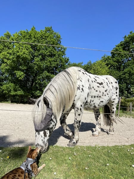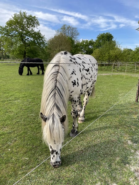 Er kennt Bodenarbeit mit Stangen, Longe am Kappzaum, freies Training und ist an Sattel und Trense gewöhnt. Er ist sehr fleißig und möchte alles richtig machen. Er hat Charakter und ist mutig. Top gepflegt, Doppelmähne und voller Schweif. Aus gesundheitlichen Gründen kann ich nicht mehr reiten und muss das Hobby nach 45 Jahren im Sattel leider einstellen. Er lebt hier bei mir im traumhaften Offenstall mit viel Weide und Sandplatz, ganzjährig draußen, so viel er möchte. Er kennt aber auch Boxenhaltung.
