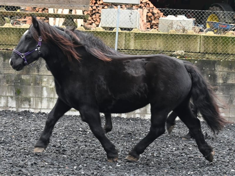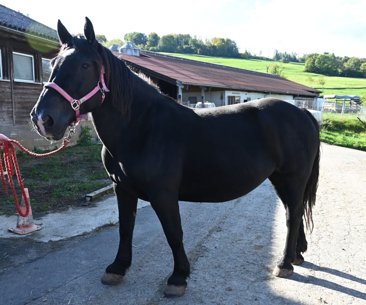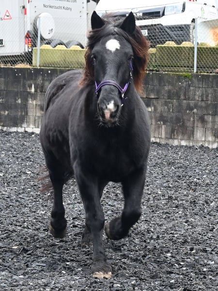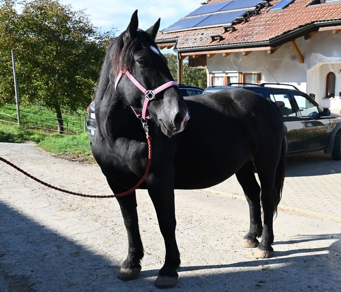 Miriam is a 156cm tall, friendly and well-behaved Noriker black mare. Her temperament is balanced and she is free of naughtiness. She was born on 04.03.2013 and has been ridden and driven in two harnesses. Miriam is registered in the studbook as a stallion dam with 7.64 points and has had several foals. Meli, her foal from 2023, can be viewed at our yard. Miriam knows the stalls as well as the open stable. She is used to children, dogs, cats and farm machinery. She is well-behaved at the farrier, she is barehoof and she gets into the horse trailer without hesitation. Miriam is regularly wormed and tested PSSM1 free. Her sire is the 1b stallion Schneider Vulkan. MV: Pongau Elmar XIV