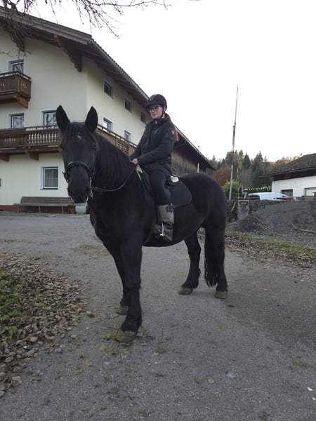 Wir würden uns von unserer Noriker-Stute Nelli trennen, da wir die Zucht dieses Farbschlags aufgeben. Nelli hat bereits an mehreren Umzügen teilgenommen (u. a. Leonhardi- und Georgiritt) und diese stets brav und zuverlässig gemeistert. Sie ist sehr robust, war noch nie krank und wird jedes Jahr gealpt. Aktuell läuft sie barhuf, wurde für Umzüge jedoch immer problemlos beschlagen. In der Herde zeigt sie sich eher rangniedrig. Unter dem Sattel ist sie meist brav und engagiert, hat aber auch gelegentlich ihren eigenen Kopf. Daher geben wir sie nicht als reines Anfängerpferd ab. Nelli wurde mit einer Wertnote von 7,59 ins Stutbuch aufgenommen.