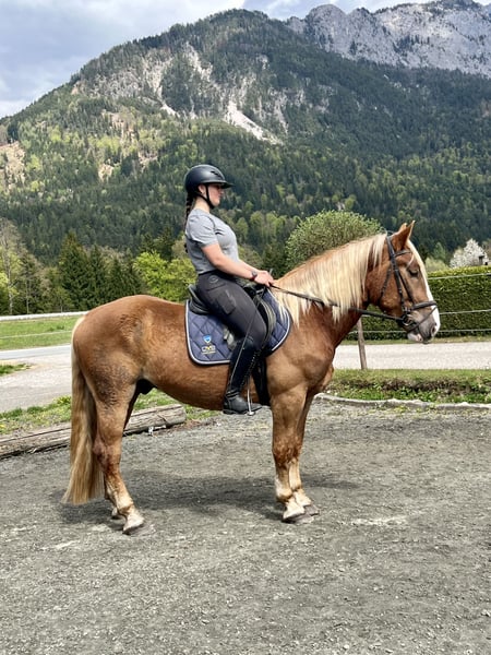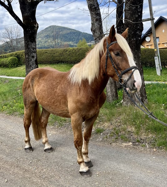 Gabor Diamant XVII Junger Norikerwallach mit bestem Charakter Abstammung: Vater: GIOVANNI DIAMANT (Dunkelfuchs) Mutter: Tina (Fuchs) Zum Verkauf steht Gabor Diamant, ein sportlicher, im kleinen Rahmen stehender (Stm. 157 Cm ) 4 jähriger Noriker Wallach, der durch seinen ausgeglichenen Charakter überzeugt. Der Dunkelfuchswallach wurde bereits zweispännig gefahren und zeigt sich dabei jederzeit zuverlässig und nervenstark und vor allem sehr fleissig und arbeitswillig. Auch im Strassenverkehr zeigt er mit seinen jungen Jahren schon gute Nervenstärke. Er wurde schonend angeritten und geht schon bereits in allen 3 Grundgangarten solide durchs Genick. Auch beim Ausreiten ist er immer interessiert, aber nicht schreckhaft. Selbstverständlich wurde Gabor regelmässig entwurmt. Die Zähne wurden bereits vor einem Monat geschliffen. Er hat auch einen vollen Grippe/Tetanus Impfschutz und ist genetisch PSSM N/N getestet. Ausserdem ist er Barhuf und wurde aufgrund seiner guten Hufe noch nicht beschlagen. Beim Hufschmied ist Gabor komplett unkompliziert und auch die verschiedenen Koppelfahrten mit dem Anhänger meistert er problemlos. Besonders hervorzuheben ist sein ruhiges, freundliches Wesen – Durch den Schulbetrieb bei uns ist Gabor es gewohnt, dass ihn ständig verschiedene Kinder putzen, führen und streicheln. Er begegnet Mensch und Tier stets mit Gelassenheit. Zwischendurch ist er immer wieder mal in der Box, aber die meiste Zeit im Offenstall. In der Herde ist er sehr rangniedrig. Aus diesem Burschen wird mal ein toller Verlasspartner für Freizeitreiter- und Fahrer Gabor freut sich auf ein liebevolles neues Zuhause!
