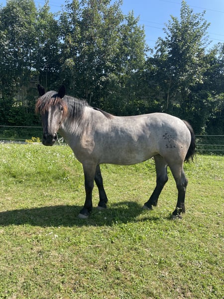 For sale is a 6.5-year-old Noriker mare. "Romina" is backed and well-ridden in walk and trot, with potential for improvement in canter. She is familiar with pole work on the lunge or under saddle. She can also go out on trail rides alone or in a group, and she is safe in traffic (road traffic, etc.).
