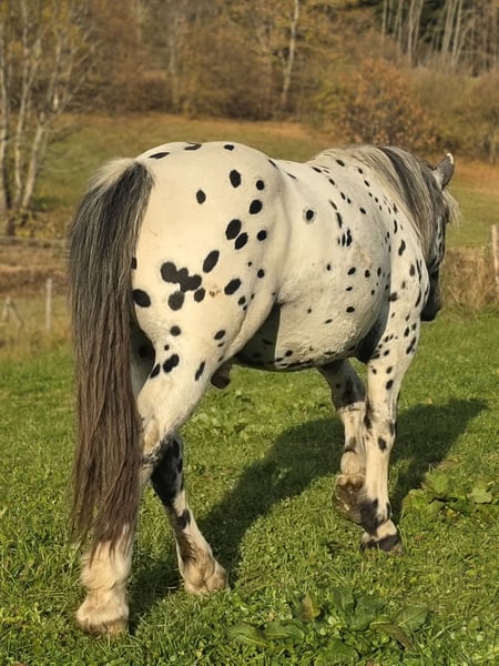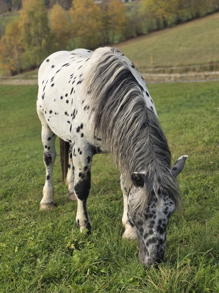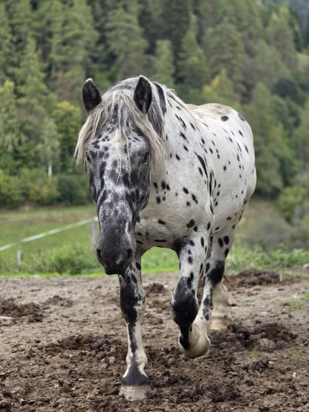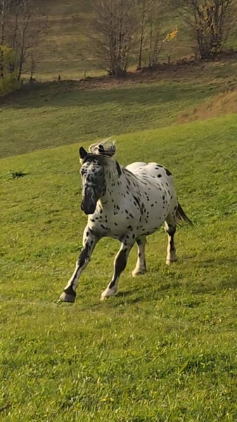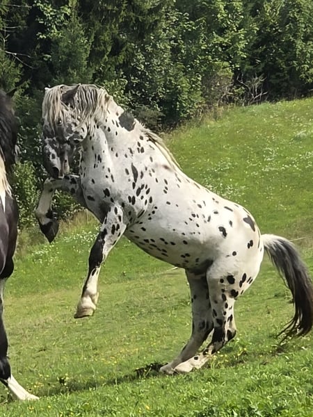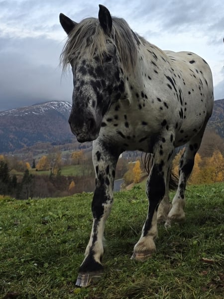 Jury Elmar, sired by Jumbo Elmar and Maike (HM) out of Focus Elmar, is a stunning young Noriker stallion born on March 27, 2023. He boasts the coveted and rare tiger coloring with beautiful markings. Jury is free from PSSM, vaccinated (against influenza and tetanus), and regularly dewormed. He is calm and well-behaved when handled by the farrier (has already been shod) and loads without any issues. He has always been kept with peers, demonstrating a very friendly and sociable nature. He is also comfortable being alone. Jury has not yet been backed or started under saddle. I wish for him to find a home where he can continue to be supported and developed according to his age. He is being offered due to downsizing. Jury will surely become a wonderful leisure horse for riding or driving sports. He has gained the necessary sure-footedness on the mountain pasture. Anyone dreaming of a black-spotted tiger Noriker is welcome to contact me. As time is very precious, I kindly ask only serious inquiries. Thank you.