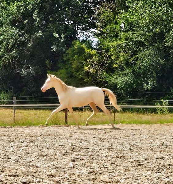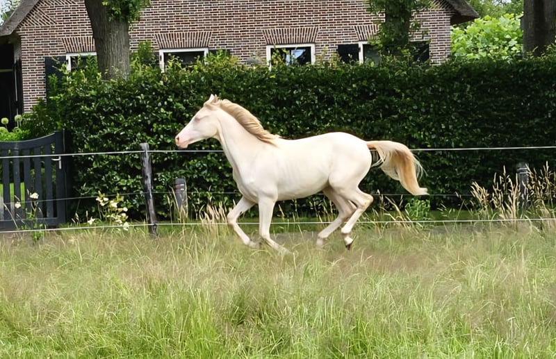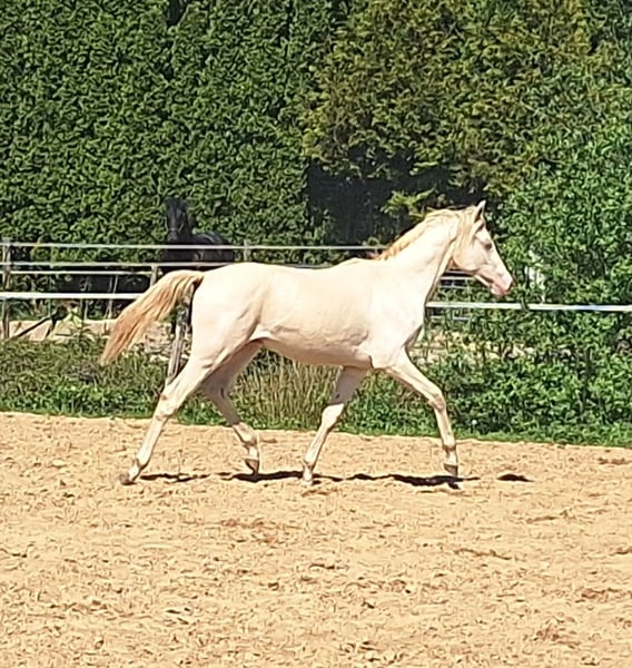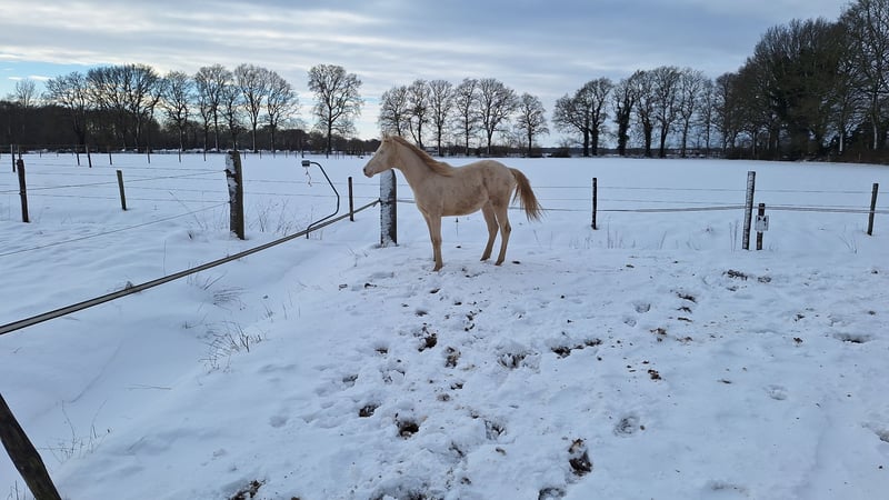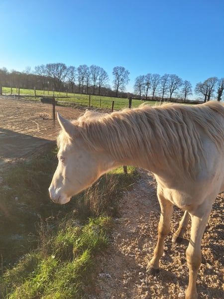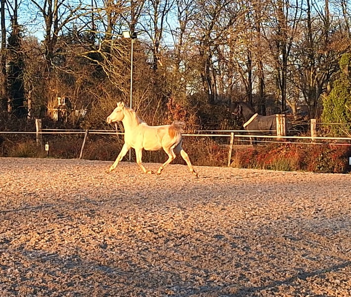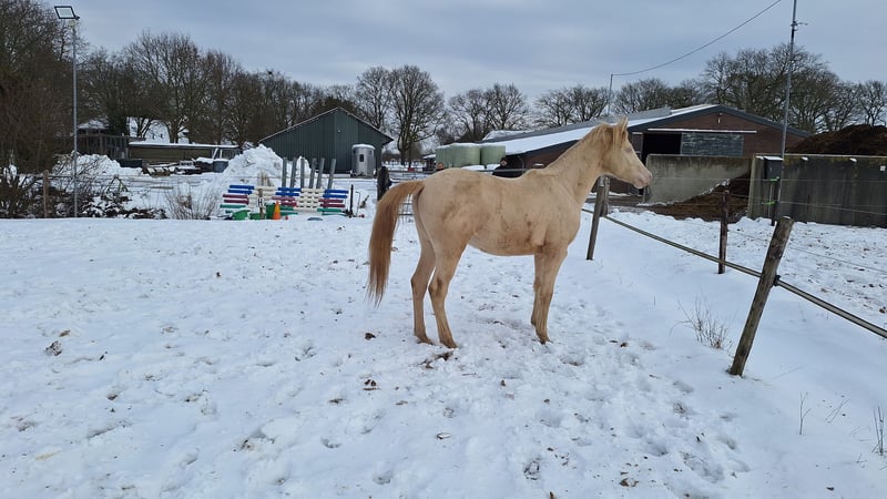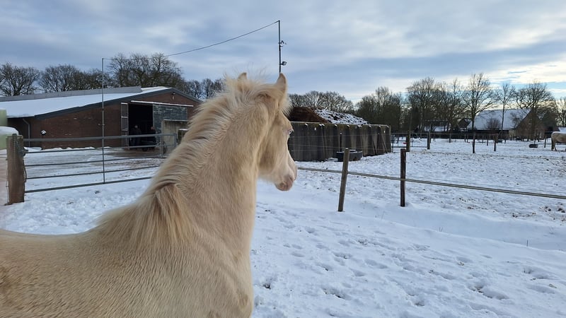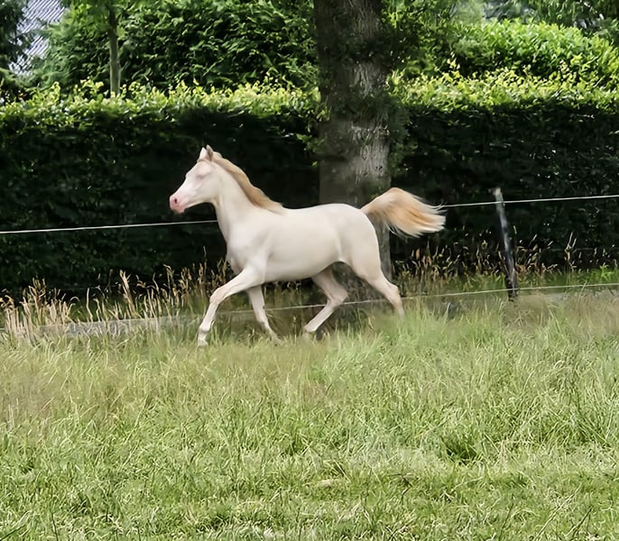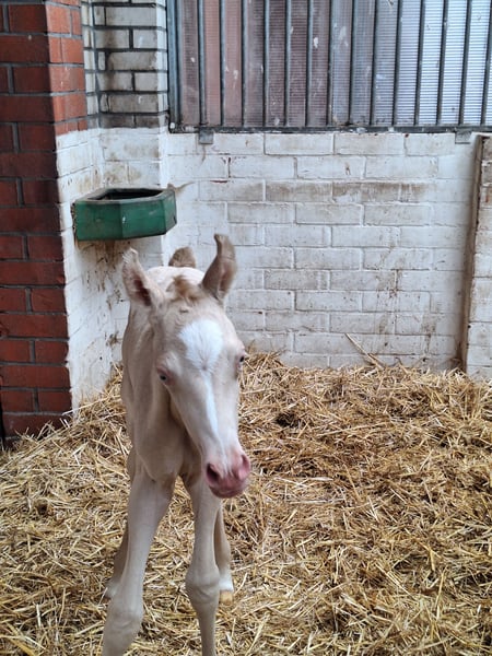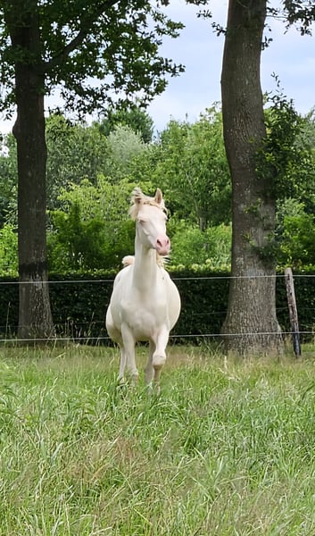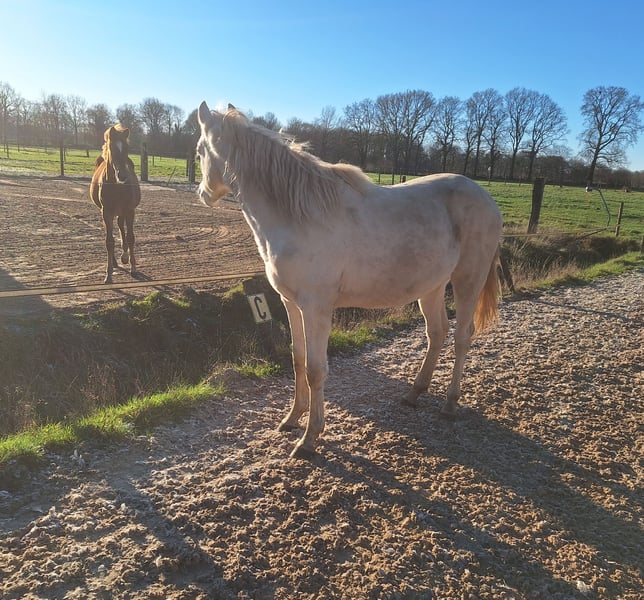 CARLÉE`S CHICORY geboren op 7 april 2024 Chicory heeft een geweldig karakter en altijd in voor een knuffel, daarnaast beweegt hij ook nog eens erg goed en mooi berg opwaarts. Hij zal uitgroeien tot een E pony en heeft de prachtige kleur Perlino. Op de NRPS keuring in Tolbert werd hij winnaar uit een grote groep all round gefokte hengstveulens, kreeg hij een eerste premie en werd reservekampioen! Zijn vader is de jonge hengst Cream de Luxe DV (Cassanova du Bois x Veenstra`s Promise. Deze prachtige, 5-jarige rijponyhengst heeft zijn kwaliteit al op indrukwekkende wijze bewezen. Hij werd in 2022 uitgeroepen tot ‘reserve kampioen 3 jarige WPBR hengsten’ en is goedgekeurd bij het NRPS en welsh stamboek. Ook is Cream na het winnen van meerdere selecties reserve kampioen geworden bij Dutch Pony Championship 2023! En niet te vergeten winnaar van de Pluvinel Jonge Talenten Competitie 2023! Cream de Luxe DV beschikt over een werkwillig karakter en een zeer goede rijdbaarheid. Zijn stap wordt gekenmerkt door grote kalmte, ijver en tact. In de draf heeft hij veel elasticiteit en kracht, maar bijzonder opmerkelijk is zijn bergopwaartse galop. Via moederskant (Lilly JCS) zien we als opa Klepholm`s Ikarios, deze van oorsprong Deense hengst staat nu al aantal jaren in Duitsland ter dekking en heeft al meerdere succesvolle nakomelingen gegeven waaronder de dekhengst HAB Grand Coleur. Moeder Lilly is nooit uit gebracht maar is dressuurmatig wel goed opgeleid zowel onder het zadel als aan de hand. Schouder binnenwaarts, travers enz. Wij besteden veel aandacht en zorg aan de veulens en maken ze bekend met alle daagse dingen. Regelmatig naar de hoefsmid, ontwormen enz. Chicory is ook bekend met de trailer. Huidige stokmaat 1.50, hij heeft volledige NRPS papieren. Vraagprijs 4950,00 Tevens te koop zijn half zusje van vorig jaar juni. Carlée's Iris Louisiana Vader Golden Daim F Kan ontzettend goed bewegen Netjes opgevoed wel iets pittiger dan haar half broer. Huidige stokmaat 130, in bezit van volledige NRPS papieren. Vraagprijs 5500 Van beide zijn video's beschikbaar.