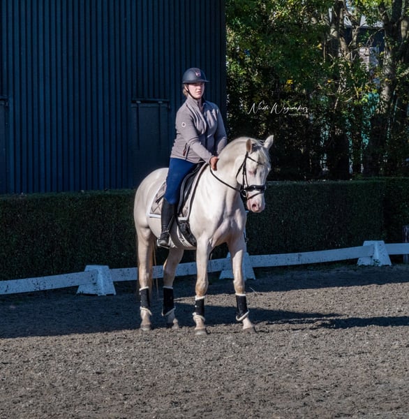 Mooi gebouwd, apart van kleur en goed bewegen. Erg vriendelijk en makkelijk in de omgang. White Dream GF (oa Weltmeyer, White Magic en Phillipo) x voorlopig keur merrie van Formidable (Florret AS) x Houston x Feinbrand uit de bekende burga Reina stam Verwachte stokmaat rond de 1.68+/- Op de keuring behaalde hij een eerste premie en uitnodiging voor de nationale keuring. Jury was erg enthousiast over hem