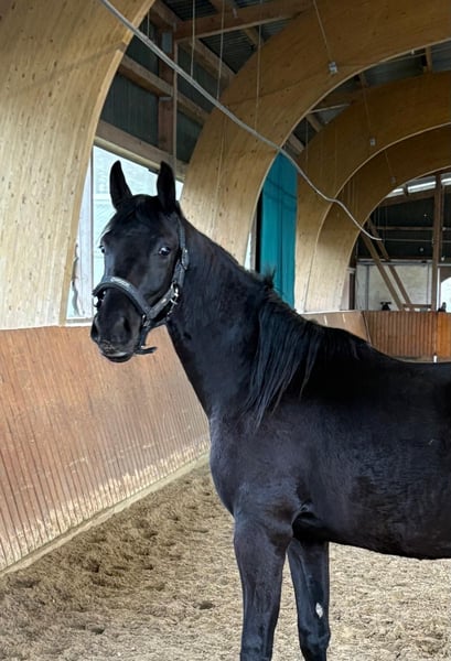 Zum Verkauf steht ein äußerst vielversprechender junger Oldenburger Wallach in schwarzer Jacke, gezogen aus bester Dressurabstammung: Raven x Rohdiamant - ein Pedigree, das für Rittigkeit, Elastizität und Leistungsbereitschaft steht. Aktuell 2 Jahre alt und im Wachstum (ca. 1,62 m, Endmaß deutlich größer zu erwarten), überzeugt dieser Rappe durch ein korrektes Fundament, schöne Linien und eine natürliche Balance in der Bewegung. Seine Grundgangarten sind raumgreifend, taktsicher und schwungvoll - besonders hervorzuheben ist sein aktives Hinterbein und die Leichtigkeit im Ablauf. Er kennt das Fohlen-ABC, ist brav im Umgang, regelmäßig entwurmt, dem Hufschmied vorgestellt und zeigt sich aufmerksam, lernwillig und nervenstark. Offenstall und Herdenhaltung gewohnt. Ein tolles Nachwuchspferd mit besten Voraussetzungen für den Dressursport oder als vielseitiger Allrounder - für Menschen, die Freude daran haben, ein junges Pferd mit Geduld und Gefühl auszubilden.