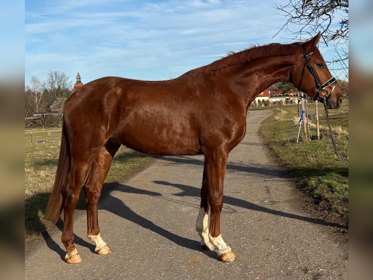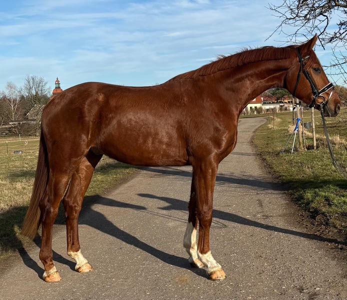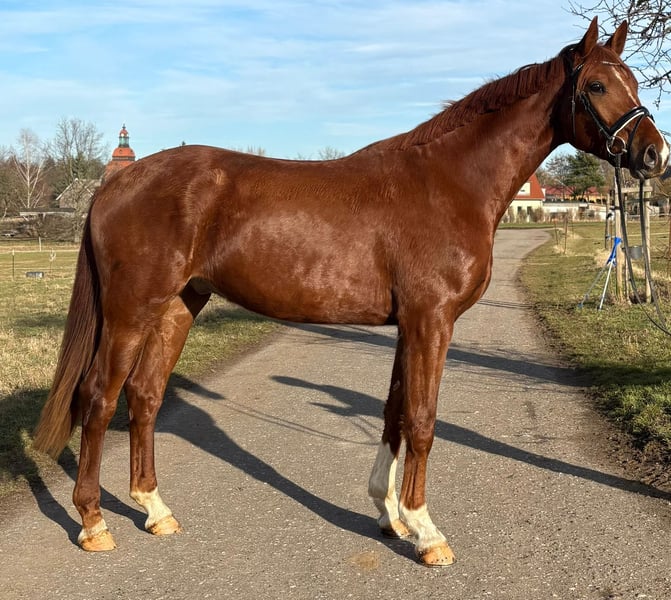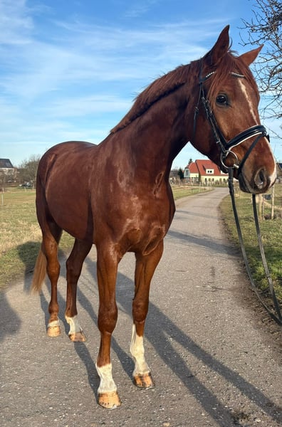 For sale is a tall, substantial Oldenburg chestnut gelding born in 2023. He is sired by Floriscount out of Dancier and impresses with very good movement, indicating great potential for dressage. He is registered as a dark chestnut and currently stands approximately 17.8 hands high. He is currently in basic training, consistently showing willingness to learn and good manners. Although initially somewhat cautious, he does not display any bad habits. He is farrier and loading friendly. Vaccinated and dewormed. His mother, De Chocolate, is a mare with excellent rideability and a solid foundation, full of vitality and health. She combines valuable genetics from Hanoverian breeding (Dancier x Wolkentanz II x Bretano II). Horses from this lineage have achieved success up to S*** level. His sire, Floriscount (Florencio I x Donnerhall), is a modern, long-legged stallion. An elegant dark chestnut with a noble appearance, he combines type, size, and presence with outstanding rideability, excellent temperament, and superb gaits. TÜV inspection available without any defects. Location: 01468 Moritzburg