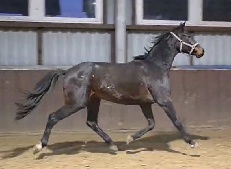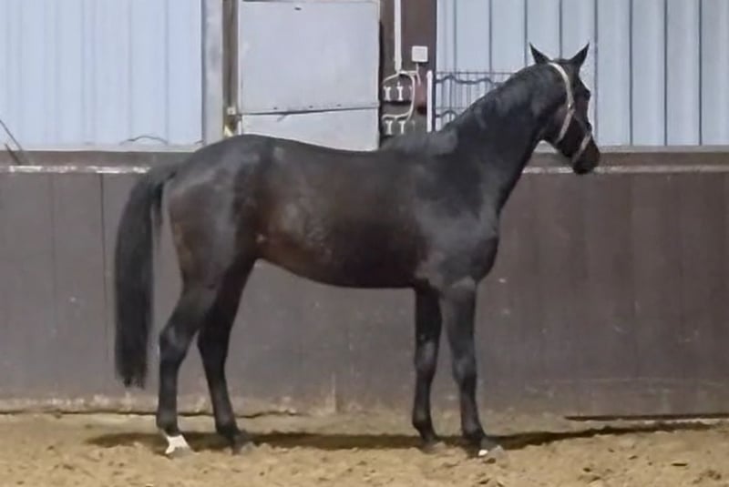 This dark bay Oldenburg gelding, now 2.5 years old, was raised outdoors in a herd of colts and was backed in November 2025. He is vaccinated, dewormed, and has had his wolf teeth removed. He has been regularly attended to by the farrier. According to his pedigree, he possesses very good basic gaits and is expected to reach a height of approximately 16.1 to 17.1 hands.