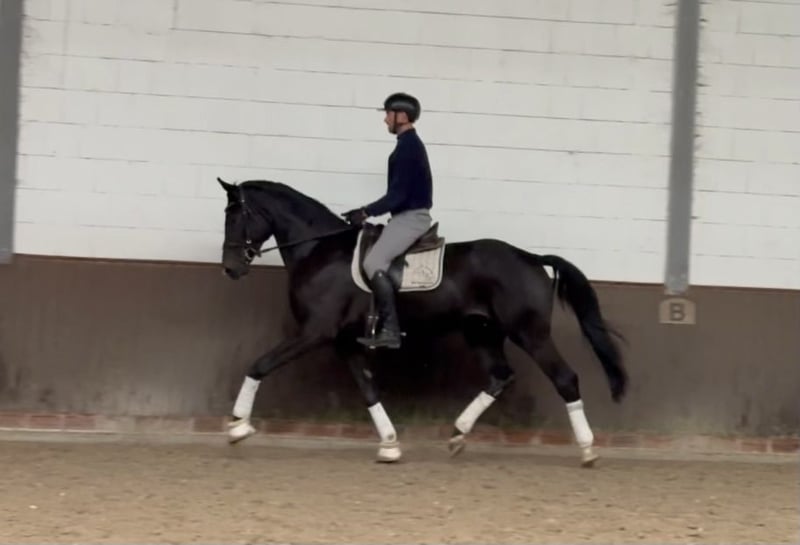 Dear prospective buyers, For questions or to arrange an appointment, please send us a WhatsApp message or an email. You can reach us on weekdays, preferably around noon. If that’s not possible, simply send a message, and we will get back to you. We look forward to hearing from you! “Theo” is a very handsome, highly personable, and quality young horse who, after only a short time under saddle, already presents himself as calm, well-ridden, and excellent in his movements. He comes directly from the breeder and hails from a very good upbringing environment. He is absolutely easy to handle and makes working together a true pleasure. Thanks to his solid basic qualities and his incredibly pleasant and positive attitude, he shows great promise as a dressage prospect. His mother is the full sister of “Quaresma,” who is currently competing successfully in the USA under junior rider Eila Fisk. An absolutely charming rough diamond with whom you can build a wonderful future together. Valid health certificate available. Directly from the breeder.