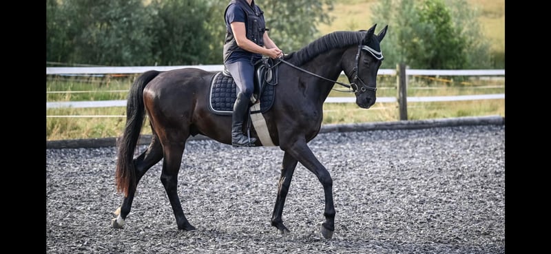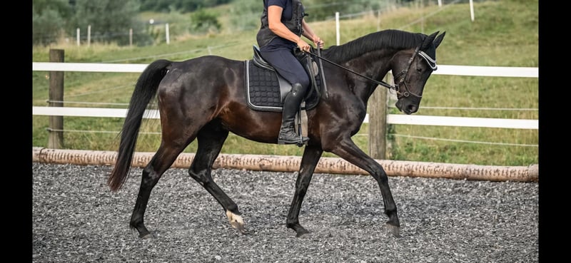 Divino has already impressed as a foal and enjoyed being admired by everyone! He was born with us and grew up in a mixed herd. He is a beautiful, people-oriented horse with a perfect conformation and foundation, and he has a great presence. Divino has been gently and carefully started under saddle with plenty of time. He is very sensitive to ride and provides a wonderful, light feeling in the saddle with a healthy go. He possesses three above-average basic gaits with a lot of impulsion from the hindquarters. Divino is familiar with groundwork, trailer loading, has been on his first short rides in the countryside, and remains completely cool in all situations. Still in development, he will grow a bit more and wishes for a hand that promotes him sportively and gently, without overwhelming him, and provides him with a horse-friendly environment. With Divino, you will receive a sports partner from the first hand, who has always been healthy, has never experienced anything bad, has been finely trained, enjoys working, and trusts his human. A horse we are reluctant to part with and will only sell to a loving home.