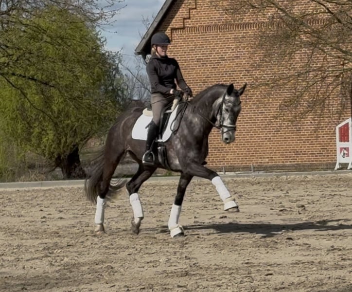 Mit Enno bieten wir einen rittigen und bewegungsstarken 7-jährigen Wallach für den gehobenen Dressursport an. Als Fohlen vom Züchter erworben, wurde er altersgerecht ausgebildet. Enno ist Halbbruder zum renommierten Vererber Floricello (Wadenspanner). Er ist siegreich in der Klasse A** sowie platziert in Dressurpferdeprüfungen der Klasse A und L. Er zeigt besonderes Talent für die Seitengänge und die Verstärkungen. Nach einer wetterbedingten Winterpause befindet er sich nun wieder im regelmäßigen Training und lernt derzeit die fliegenden Wechsel. Enno zeigt sich lernwillig und bringt Potential für das große Viereck mit. Außerdem geht er gerne ins Gelände und wurde im Springen bis zur Kl. A gefördert. Da ich ihm aus beruflichen Gründen zeitlich nicht gerecht werde, suchen wir für ihn einen routinierten und ambitionierten Reiter, der diesen Rohdiamanten weiter fördert. Ein moderner Sportler für das große Viereck, der bereit ist für den nächsten Karriereschritt. Dreijährig wurde ein einwandfreier Züchtertüv angefertigt, darüber hinaus gibt es bislang keinen Tüv. Enno war noch nie lahm. Um Reittourismus zu vermeiden, erheben wir für Probereiten eine Gebühr von 25€, die beim Kauf verrechnet wird.