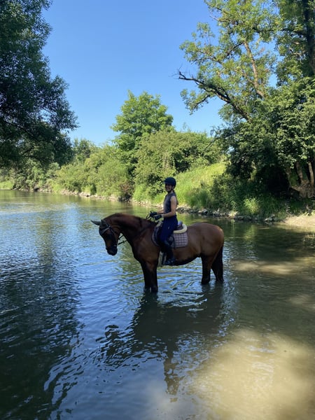 Wir suchen ein neues Zuhause für unseren Fuchswallach Cortino. Er ist 15 Jahre alt, 170 cm groß und seit 7 Jahren bei unserer Familie. Er ist gesund und super gepflegt. Er hat Freude an Dressur-und Cavalettiarbeit. Gelegentlich mal ein kleines Sprüngchen/Kreuz zuhause macht er brav. Er ist ein gemütlicher Typ, hat super weiche Gänge und ist angenehm zu sitzen. Dressurlektionen wie fliegende Wechsel und Außengalopp beherrscht er. Cortino ist ruhig und verschmust, er liebt es, betüttelt zu werden. Er ist super entspannt, lässt sich durch nichts aus der Ruhe bringen und ist ein absolutes Verlasspferd. Er geht brav ins Gelände, alleine oder in der Gruppe. Cortino ist die letzten Jahre A-Springen gegangen, Hänger-Fahren und fremde Plätze sind für ihn kein Problem. Beim Schmied ist er ein absoluter Musterschüler. Er wird turnusgemäß geimpft und entwurmt. Er ist Boxenhaltung mit täglichem Koppel/Paddock-Gang gewohnt (Einzelkoppel oder mit 1-2 Wallachen) und geht regelmäßig in die Führmaschine. Aktuell hat er 4 Eisen. Am sportlichen Parcours-Reiten hat er leider keine Freude mehr. Deshalb suchen wir nach einem Platz für ihn, wo er nicht mehr aufs Turnier muss und als Freizeitpartner im Mittelpunkt steht. Wir suchen für Cortino ein optimales Zuhause, der Preis ist nicht vorrangig. 7.000 VHB