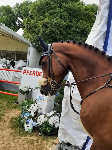 Cosma von Oldenburg – international erfolgreiche Stute für die Zucht Zum Verkauf steht die außergewöhnliche Oldenburger Stute Cosma von Oldenburg, 12-jährig, aus bestem international bewährtem Leistungsblut. Abstammung: Colman II x Lätitia III (Levisto Z II) – modernes, sporterprobtes Blut mit hoher Vererbungsqualität. Cosma war selbst international hoch erfolgreich im Springsport und vielfach in schweren Springen platziert. Sie startete und platzierte sich u. a. auf renommierten internationalen Turnierplätzen wie Kreuth, Mannheim (Maimarktturnier), Balve Optimum, München-Riem, Donaueschingen, Bisingen, Albführen, Lamprechtshausen sowie international in Spanien. Zudem gewann sie mehrfach Barrierespringen mit Höhen bis 1,90 m. In M**-Springen und S-Springen war sie noch bis ins letzte Jahr hinein mehrfach platziert. Ende letzten Jahres zog sich Cosma auf dem Paddock eine leichte Sehnenverletzung im Bereich der Hufrolle zu. Diese wurde tierärztlich begleitet und behandelt, das Pferd erhielt konsequent Pause. Aktuell kann keine Garantie für eine vollständige sportliche Belastbarkeit gegeben werden. Eine Regeneration mit möglicher Wiedereinsetzbarkeit im Sport ist denkbar, ein verbleibender Schaden jedoch nicht auszuschließen. Aus diesem Grund wird Cosma ausdrücklich und ausschließlich als Zuchtstute angeboten. Züchterisch bringt Cosma alles mit, was heute gefragt ist: Sie verfügt über ein sehr gutes Fundament, einen harmonischen, korrekten Körperbau, viel Rahmen und Ausdruck sowie eine außergewöhnlich positive Einstellung. Ihr Charakter ist absolut unkompliziert – sie ist super brav im Umgang, beim Schmied, beim Verladen und Transport sowie im Gelände. Sie ist rittig und klar im Kopf und war problemlos auch von weniger routinierten Reitern zu handhaben. Gerade in der Zucht ist Cosma besonders interessant, da sie nicht nur erstklassig gezogen, sondern selbst hoch erfolgreich im internationalen Spitzensport war – eine Kombination, die heute selten und äußerst wertvoll ist. Ihre Leistungsbereitschaft, Vermögen und Einstellung machen sie zu einer Stute mit exzellentem Vererbungspotenzial. Cosma befand sich leistungsmäßig im sechsstelligen Bereich. Aufgrund der beschriebenen Vorgeschichte wird sie nun deutlich unter Wert in allerbeste Züchterhände abgegeben. Preis: 7.500 € Verhandlungsbasis (je nach Platzierung/Zukunkunftsperspektive) Nur ernst gemeinte Anfragen von Züchtern, die das besondere Potenzial dieser Stute zu schätzen wissen.