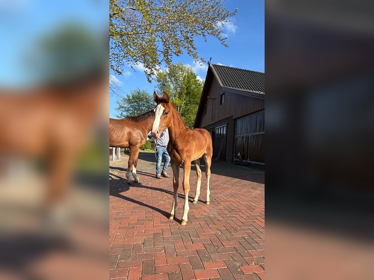 For sale is a filly, born at the end of February 2025. The foal is typy, correct, and very growthy; her colorful chestnut color also makes her visually something very special. She moves freely through her body and already shows a powerful uphill canter. The sire, Capital One, has been very successful in show jumping competitions and qualified for the Bundeschampionat last year. His first crop of foals impressed with type, size, and movement quality. The dam competed in sports before her breeding career and was successful up to show jumping classes of level M. A full sister of the dam has placed up to S level. The Oldenburg maternal line of Kundi boasts a variety of sport horses and licensed stallions from direct relatives and is known for its durability and willingness to perform. Anyone looking for a future gem for breeding and sport will find it here. If you are interested or need further information, please feel free to contact me.