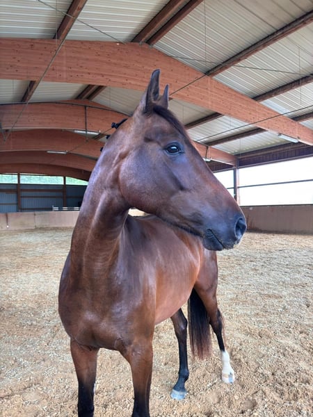 Genesis is a very people-oriented, attentive, and typy Oldenburg mare. She was raised in a family environment directly with the breeder. She is familiar with the saddle, bridle, and lunging in the arena and in the indoor. She also accepts being mounted and led at a walk without any issues. During free jumping, she shows good overview and courage. She willingly goes onto the trailer, although she has not been transported yet. We are reluctantly letting her go due to a lack of time and the discontinuation of our breeding program. Videos available upon request.