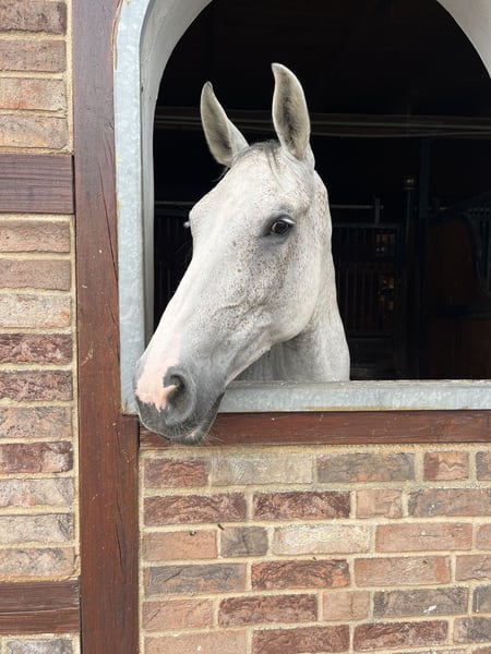 This 10-year-old grey mare has been in my possession since her foalhood. At age 8, she competed successfully in S-Class show jumping and has remained clear in M* and M** classes this year as well. She enjoys being ridden and lunged, and she likes gymnastics work. She could potentially have a "second career" as a dressage horse, although she has not yet been introduced to dressage competitions. However, since she can sometimes startle and make a small side jump, she is not ideally suited for complete beginners. She is very well-behaved in handling and has no faults. Current X-rays are available.