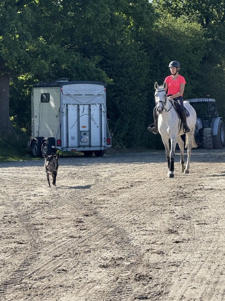 Esta yegua gris de 10 años ha estado en mi posesión desde su potro. A los 8 años, obtuvo colocaciones en salto a nivel S y, este año, ha sido limpia en competiciones de M* y M**. Disfruta trabajando bajo la silla y a la cuerda, realiza ejercicios de gimnasia con gusto y podría considerar una "pequeña segunda carrera" como caballo de doma (aunque hasta ahora no ha sido presentada en competición de doma). Sin embargo, dado que a veces puede asustarse y dar un pequeño salto lateral, no es recomendable para principiantes absolutos. En su manejo, es muy tranquila y no presenta defectos. Se disponen de radiografías recientes.