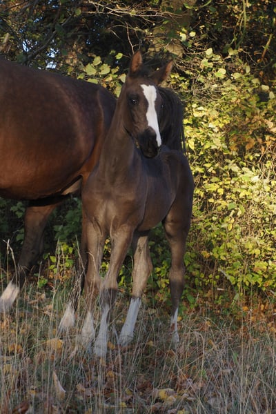 Beautifully colorful and eye-catching, this very promising black filly has an outstanding pedigree and double talent! With the typical clear-headed and balanced temperament characteristic of the Café au Lait line, this young horse will be an excellent partner for professionals, amateurs, and less experienced riders alike, whether for sport or leisure! She comes from the second crop of our young stallion "Cafe's Don Rubin," who already impressed at his licensing at just three years old, being the youngest horse in the competition! Born only in August, he stood out despite being half a year younger than many other three-year-olds, thanks to his coolness, ease of movement, and positive work attitude. Last year, at four years old, he immediately won the Spring Horse A class and was the only four-year-old placed highly against five- and six-year-olds with an 8.0 score! He then won bronze in the final of the Dobrocker Deister Spring Horse Championship in his first Spring Horse L class!! Subsequently, he also achieved multiple wins in Spring Horse L. Despite his young age, he also serves as a children's riding horse for our eight-year-old daughter and easily competes in E-jumping with twelve-year-old boys. He has now been placed in Spring Horse M and qualified for the Bundeschampionat. He impresses all around with his quality, both in movement and exterior! Daily, he amazes with his rideability, willingness to learn and perform, always calm and composed like an old hand. A dream in the terrain as well! Absolutely no stallion manners despite wearing a blanket. Our foals receive daily mineral feed and foal starter, regular EQUISTRO Haemolytan and Ipaligo Foal, deworming, and farrier visits are of course routine. The mare herd also receives special broodmare feed, daily forage and linseed oil throughout pregnancy, as well as hay ad libitum. This ensures our offspring are always in optimal health. Further foals and young horses from our own breeding are available upon request. We also occasionally have broodmares for sale, all in foal. Video inquiries, etc., are only possible via WhatsApp in advance!