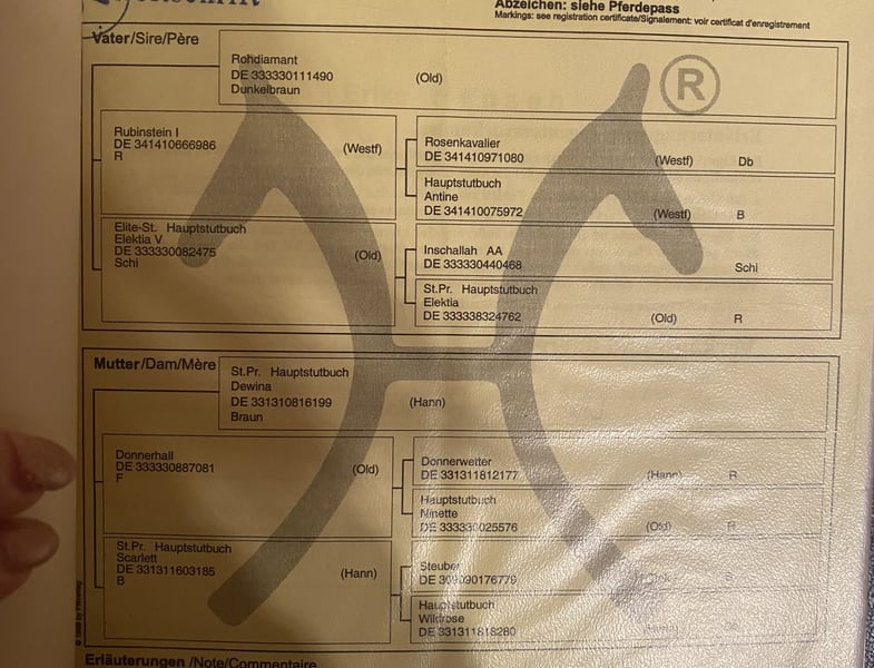 For sale is Roxanne, a 20-year-old mare from top-class dressage lineage – ideal for breeding. Pedigree: Sire: Rohdiamant – one of the world's best sires for rideability, two-time Bundeschampion, main premium winner, and Grand Prix winner. His offspring are distinguished by their rideability, expression, and willingness to perform, achieving success at international competitions up to Grand Prix level. Maternal Grandsire: Donnerhall – a dressage legend with over 120 S-level winning offspring, known for excellent rideability, charisma, and work ethic. Donnerhall's descendants have dominated international dressage for decades and are highly sought after both in sport and breeding. Breeding Successes: Roxanne has already given us two filly foals and one colt foal. The births have always been uncomplicated, and all foals were born healthy. They are well-behaved with the farrier and veterinarian, quickly accustomed to haltering, leading, and daily handling. Additionally, they impress with excellent movement, a sporty and typy conformation, as well as a balanced and friendly disposition – the best prerequisites for dressage sport. Roxanne herself captivates with her good temperament, balanced character, and is absolutely uncomplicated in daily handling. Only to be placed in the best hands! As she currently has a foal at her side, she will only be available from January 2026. If interested, please feel free to call 0170 9118712.