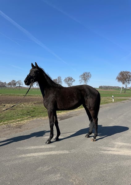 Morricone x Wynton x Wellington Sehr Edle und hochbeinige Stute in schwarzer Jacke. Die Stute stammt aus einer erfolgreichen Zucht. Ihre Mutter selbst erfolgreich im Dressursport eingesetzt. Der Vater Morricone sehr bekannt und erfolgreich. Die Stute ist bereits anlongiert und hat drei sehr gute Grundgangarten. Anfragen bitte nur über WhatsApp unter 01779736387
