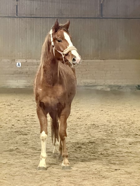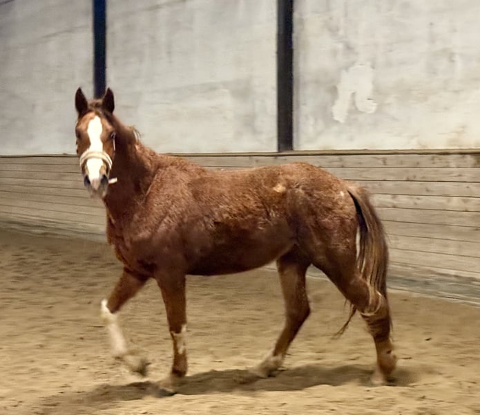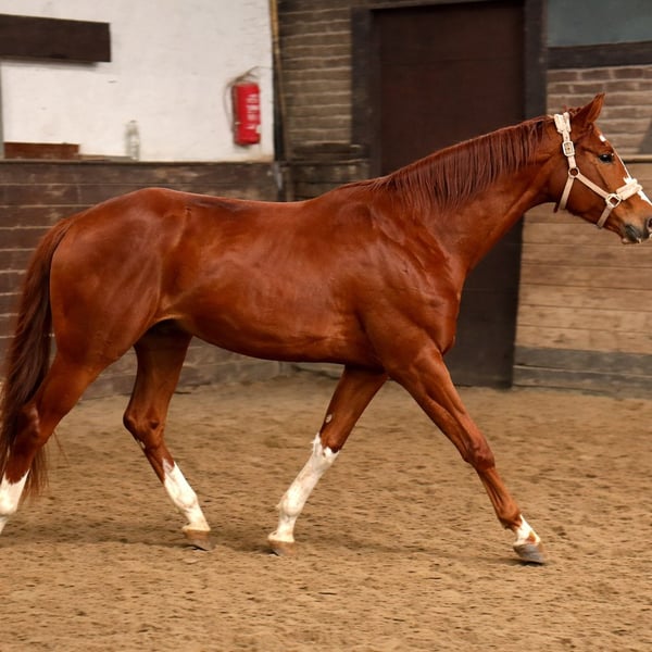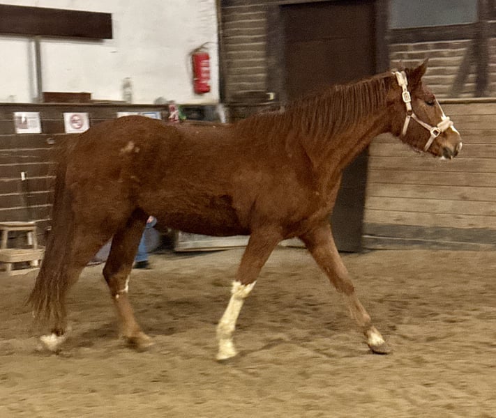 A colorful three-year-old dark chestnut mare by Selfmade out of Dancier x Londontime is for sale. She has three very good basic gaits. Currently, she is still in the herd on winter pasture/rearing stable, in her winter coat (for a better idea, see the AI-generated summer coat photo). The videos are from January 27, 2026. The mare is still completely green, has no experience with a bridle or riding equipment. She is accustomed to being tied up and loaded into a trailer. Handling-wise, she is typical for a horse of her age, showing no extreme or unusual behaviors. She has been healthy so far. X-rays or veterinary certificates are not available yet but can be arranged at the buyer’s expense if needed. Her dam, a Dancier x Londontime mare, is the brown mare shown in the pictures. She was raised directly by us, the breeder. In winter, she stays with the herd in an active stable with plenty of turnout, and in summer, she is on large 24-hour pasture. The horses are regularly trimmed by the farrier, dewormed, and mineral feed is provided as standard. We have had 5-10 foals each year and sell them because we cannot keep them all ;) These are the last generations, as we have ceased breeding. We are happy to arrange a viewing appointment, also via WhatsApp. Weekdays or weekends – both options are possible! Location: Rearing stable in Mainz-Bretzenheim, Im Tiefentaler Weg 1.