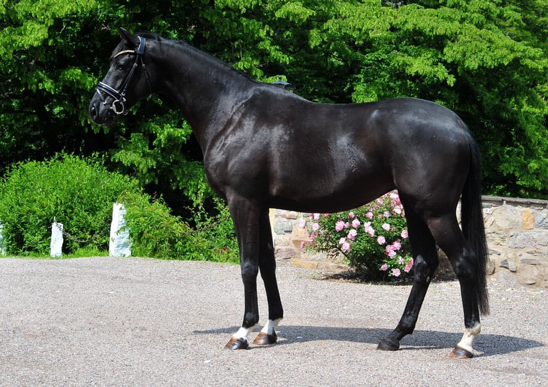 Incredibly charming and athletic Oldenburg black mare that is highly interesting for both breeding and sport. She has three very good and rhythmic basic gaits - she is light-footed and comfortable to sit on. She has been lightly backed. A mare with a lot of spirit and go. She also shows great joy and style when free jumping. A mare that can be well imagined in the dressage arena or in eventing. Closely related to the successful sport horses Seal, Schwalbenmelodie, Sergeant Pepper TSF, Dark Diamant, Starlet, Stauffenberg, Songline, Stradivari, Showmaster, and Schwadroneur.