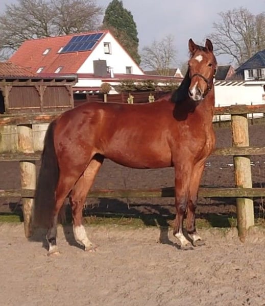 Beautiful mare, like painted! Everything fits perfectly together: this stunning, charming mare has a good, powerful movement with a lot of rhythm. Her exterior and interior leave nothing to be desired. Offspring from this mare's lineage have been successful in youth/amateur competitions as well as up to the advanced class in sports. X-rays from 2024 are available, with no findings. If desired, the horse can remain with us for further upbringing and training after purchase, if you appreciate our philosophy, in exchange for a contribution towards feed and work.
