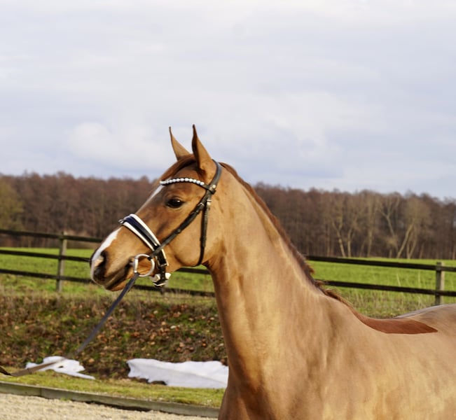 For sale: a promising Oldenburg mare, born in 2022. This elegant chestnut mare demonstrates strong foundational qualities. With a height of 16.1 hh, she offers the ideal size for ambitious dressage pursuits. She has been presented in solid, well-ridden condition and already shows initial signs of a harmonious basic training. Her refined conformation and balanced temperament make her a promising young talent for the dressage arena. This young Oldenburg mare is a true potential for high-level dressage and is suitable for both dedicated leisure riders and future competitive riders. If interested, I look forward to hearing from you.