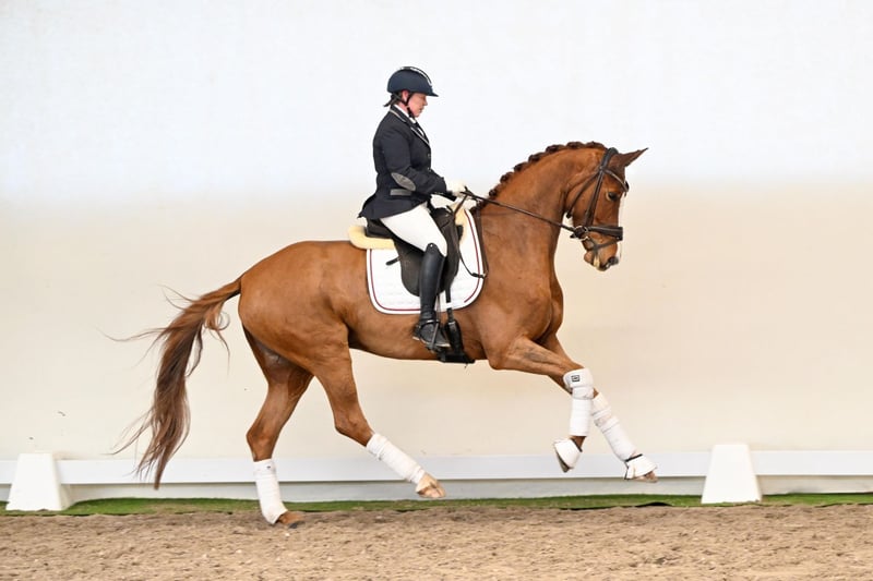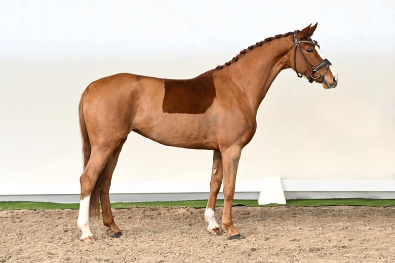 Juna Jackpot, a five-year-old mare with a modern sport horse type, captivates with power, elegance, and natural presence. Built uphill with elastic, flowing gaits and an expansive, uphill-carrying canter, she combines noble refinement with a striking appearance. Her honest, friendly character makes her a horse that impresses both under saddle and on the ground. Her pedigree reflects the best of modern dressage breeding: her sire Janeiro Platinum passes on elegance, refinement, and outstanding movement to his offspring. Her damsire Londontime, the legendary Hanoverian stallion and state stud sire at Celle, contributes rideability, willingness to perform, and numerous S-level successful progeny. The damline is further strengthened by Weltmeyer, one of the most influential dressage sires worldwide, renowned for exceptional mechanics, rideability, and a powerful hindleg. Juna Jackpot presents herself as a harmonious, willing-to-learn horse with natural self-carriage, uphill movement, and expressive gaits. A young mare who impresses through character, quality of movement, and refinement – ready to develop into an outstanding dressage partner.