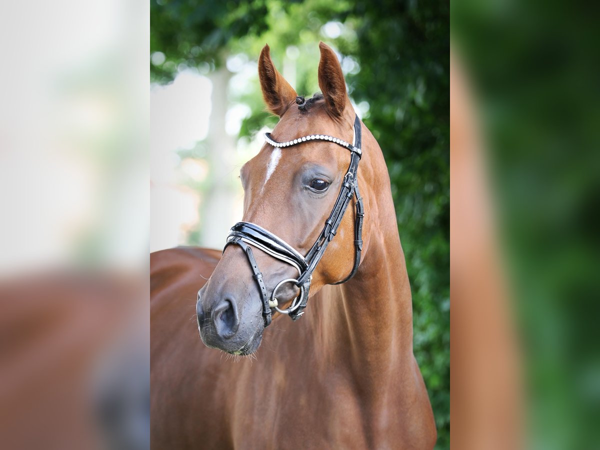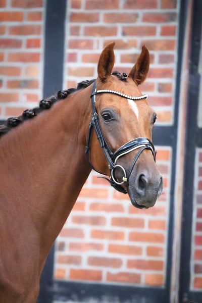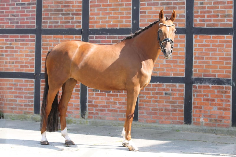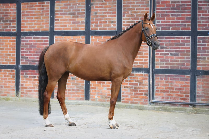 Beautiful Oldenburg Mare for Sale For sale is a pregnant Oldenburg mare, born in 2020. She presents herself in an elegant dark chestnut coat and has a height of 165 cm. This mare comes from a top-quality breeding and combines excellent bloodlines. Pregnant by By Your Side for 5/26. Her friendly and open nature makes her an ideal partner for all levels of experience. She is well-socialized and has a balanced character. Due to a pasture accident, she is not rideable. Genetically in top health. If you are interested or have further questions, please feel free to contact me. Visit us and see for yourself this wonderful mare!