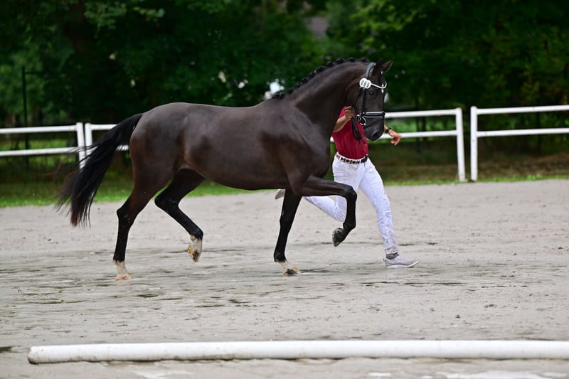 3j. Eingeritten und Leistungsprüfung erfolgreich absolviert, Endring/Brilliantringstute ihres Jahrgangs 3 Fohlen in Folge mit guten Reitpferdepoints, besonders hervorzuheben jeweils der sehr gut Galopp Super lieb im Umgang, total Herdenverträglich, sehr gute Zuchtstute - ob TG oder FS bisher immer beim 1. Versuch tragend. Abfohlung ohne Probleme, Erstversorgung, Führen des Fohlens inder Herde. Auch als Reitpferd möglich muss aber wieder abgeschoben werden. Wir werden sie nicht besamen. Bei erfolgtem Verkauf kann aber eine Besamung bei uns durchgeführt werden. Informationen zum Stamm - Bruder war Prämienhengst der südd. Körung https://www.horsetelex.de/horses/pedigree/2581167/de-schoonheid