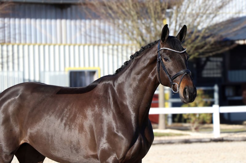 « Goldie » est un cheval pour l’avenir. Elle possède un caractère doux et calme, est sociable avec ses congénères, ouverte et amicale envers l’humain, et très bien éduquée. Cela la rend totalement facile à manipuler : ferrure, chargement, rien ne pose problème. Goldie n’est pas chaude, on ne remarque pas de chaleurs ou autres signes, et elle n’est ni chaude ni trop sensible au niveau des jambes ! La jument nous arrive directement du naisseur. Goldie séduit un large public. Elle convient aussi bien à un cavalier de dressage ambitieux, à la recherche d’un cheval à former et à faire progresser, qu’à un amateur. Grâce à son tempérament calme et fiable, elle gère très sereinement le cavalier et les nouvelles situations. En selle, Goldie impressionne par ses excellentes allures de base et sa grande qualité de dressage. Elle se déplace en extension avec aisance, est confortable en selle et toujours désireuse d’apprendre. Fine au mors, réactive au siège, ses qualités permettent à chaque cavalier de briller. Elle peut faire des galops en extension, des changements simples, des figures de côté, des travers, et réalise déjà de très beaux changements de pied. Goldie a déjà participé à plusieurs stages et entraînements en extérieur, qu’elle a parfaitement maîtrisés. La charger seule et la seller en dehors de chez elle ne pose aucun problème. Elle connaît le travail à la longe ainsi que le travail avec des barres et la gymnastique, et reste toujours motivée et très expérimentée dans ces exercices. Informations importantes : • Les tailles au garrot sont estimées et non mesurées précisément. • Toutes les descriptions sont des évaluations subjectives du vendeur et ne constituent pas des garanties. • L’organisation d’un transport vers sa nouvelle maison ne pose aucun problème. Des radiographies récentes sans anomalies ainsi qu’un examen clinique impeccable sont disponibles. Pour toute question ou pour organiser une visite, n’hésitez pas à nous contacter par téléphone au 015140555583. Nous sommes joignables également le week-end et pendant les jours fériés. Une séance d’essai en dressage peut être organisée à tout moment.