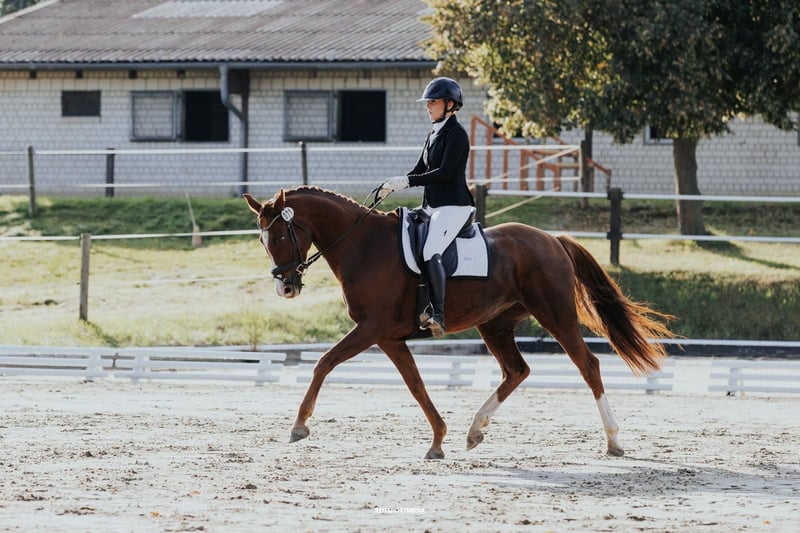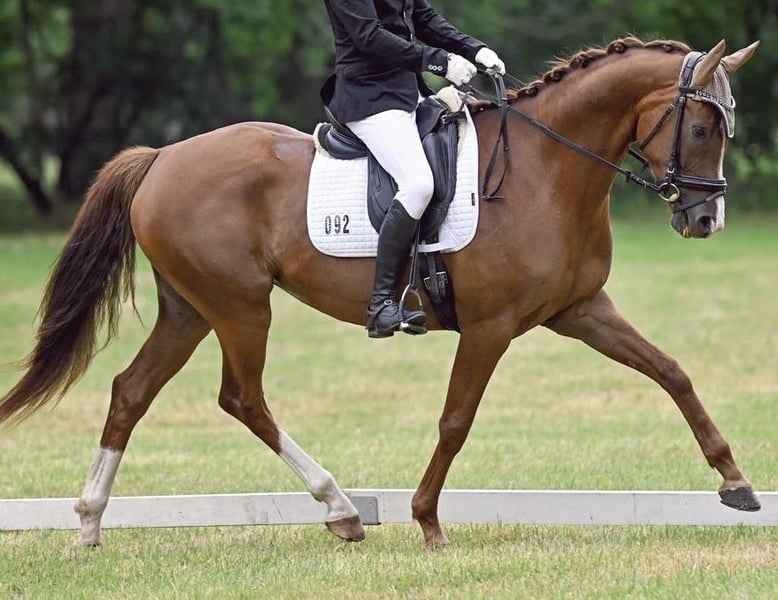Aktuelle Röntgenbilder (Huf, Bein, Rücken vom 16.03.2026) OHNE BEFUND Können bei ernsthaftem Interesse versendet werden. | Alter: 8 Jahre | Stockmaß: 166 cm | Abstammung: Dancier x Rubinstern Noir | Farbe: Dunkelfuchs Danci überzeugt nicht nur durch ihr elegantes Exterieur, sondern auch durch ihr Talent und ihre Rittigkeit. Bereits A-Dressuren mit Noten um 8,0 gewonnen, sicher in L-Lektionen eingeführt, Außengalopp und fliegende Wechsel beherrscht sie spielerisch. Sie ist fein an den Hilfen, leicht in der Hand, sensibel und sehr lernbereit – ideal für ambitionierte Reiter mit feinem Sitz und Erfahrung in der Jungpferdeausbildung. Wer ihr Sicherheit und Vertrauen gibt, findet in Danci eine Partnerin mit Perspektive bis in die höhere Dressur. Im täglichen Umgang ist sie unkompliziert, menschenbezogen und anhänglich. Röntgen-TÜV ohne Befund, regelmäßig geimpft, entwurmt und Zähne gemacht. Wir wünschen uns für Danci ein liebevolles Zuhause mit artgerechter Haltung und Pferdegesellschaft. Platz vor Preis. Vorstellung und Probereiten nach Absprache (50 € Aufwandsentschädigung, bei Kauf verrechnet).