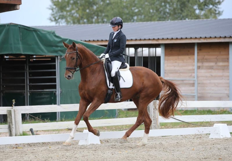 For sale: 8-year-old Oldenburg mare Le Vivaldi x Fürst Heinrich with a height of 172cm, directly from the breeder. The mare has been started and trained by the breeder, has always been in one hand, and is a cuddly horse. Transport and farrier are no problem. She has never been sick or injured, has no vices, and comes with a 1* vet check including back X-rays. The chestnut has very good movement, is very willing to work, and always wants to do everything right. Trained up to LM level. Only to be placed in good hands.