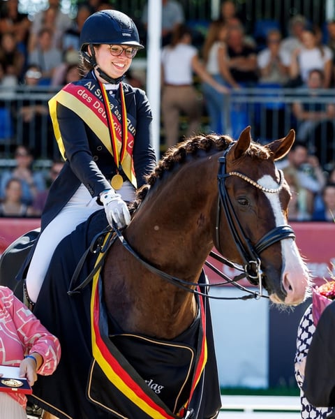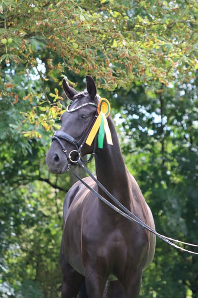 Oferujemy tutaj bardzo interesującą klacz hodowlaną po samodzielnie odnoszącym sukcesy ogierze Baron, który wyróżnia się szczególnie swoją skocznością. Matka klaczy pochodzi od klaczy Sally, która już wydała na świat kilka wspaniałych klaczy sportowych. Baronesse była w przeszłości użytkowana jako koń skokowy, a w 2024 roku została zapłodniona. W marcu 2025 roku urodziła pięknego, długonogiego ogiera od aktualnego mistrza Niemiec, Sky. Źrebię zostało sprzedane w ręce, które będą wspierać jego rozwój sportowy. Na rok 2026 Baronesse jest w ciąży z wiceświatowym mistrzem Glamdale WP.