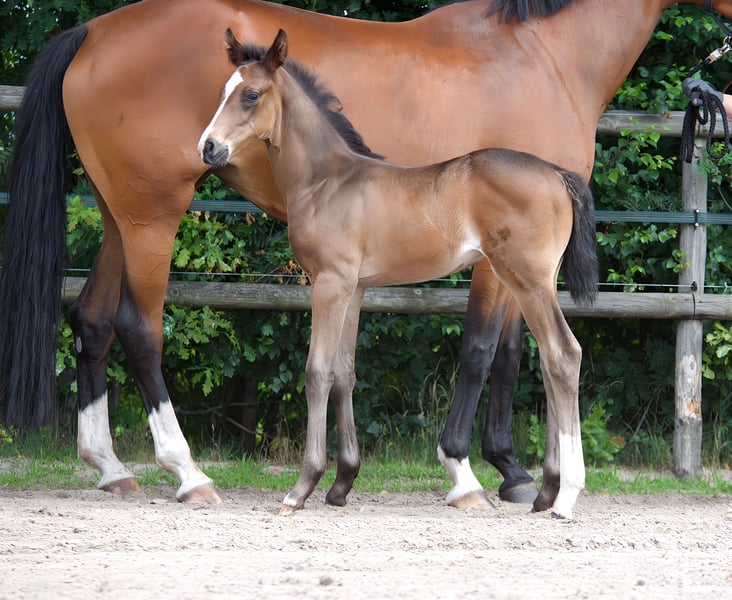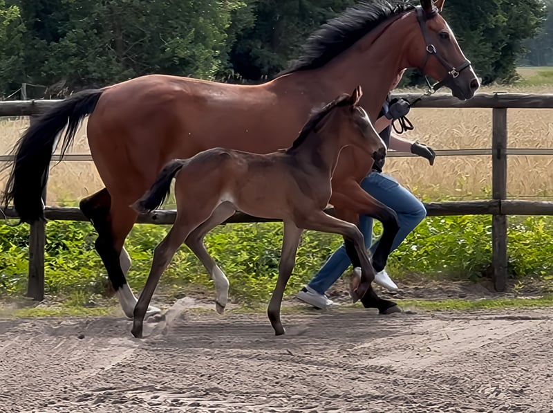 For sale is this extraordinary colt by Escamillo x Benicio x Lauries Crusador, born in June 2025. The mother, Buena Vista, comes from the Oldenburg line 77 of Feldgold. In the competition year 2021, she was placed multiple times in riding horse tests and dressage horse tests of class A. In 2021, she completed the mare performance test (OL) and received, in addition to the main premium eligibility (State Premium), an invitation to the elite mare show in Rastede. In the competition year 2022, she was placed multiple times in dressage horse tests of class A and L. Siblings of the mare (from the mother Luise): Full brother Ben Vito (2013) by Benicio x Lauries Crusador has already won at S level at the age of seven and was a German reserve for the World Championship of Young Dressage Horses in Ermelo 2019 at the age of six. He himself was qualified multiple times for the Bundeschampionat and is a flagship of his father Benicio. Placed in St. Georg, won S*, placed in dressage horse M, won dressage horse L. Donna Clara (2008) by Don Frederico x Lauries Crusador is already successful at S level. Placed in Inter I, won M** dressage, placed in dressage horse M, won dressage horse A. Doktor Bee (2012) by Destano x Lauries Crusador is successful in the heavy class. Placed in Inter I, won M** dressage, placed in dressage horse M. Location: Hude (Oldenburg)