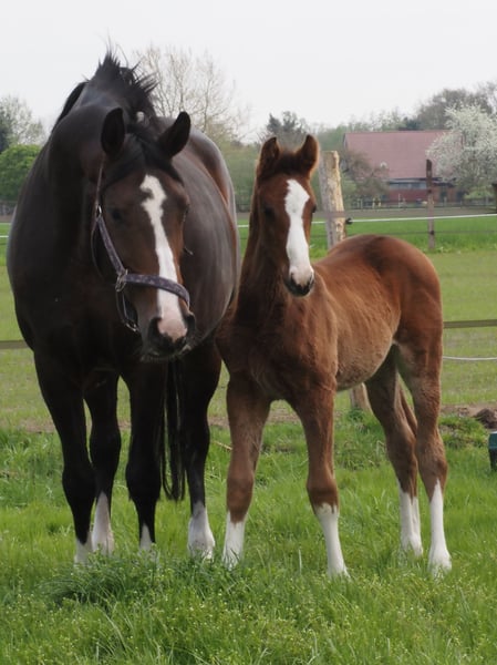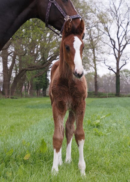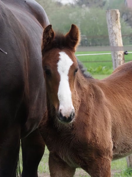 Beautiful colorful Totilas grandson with recognition value!!! 4x bright white with wide blaze! Drawn as if painted, he already attracts everyone's attention! Dam herself placed in novice and elementary level dressage tests until she switched to breeding. His sire Cafe au lait, winner of his licensing, HLP winner and BuCha finalist, was himself victorious in the advanced classes and has made a name for himself in recent years as a double sire with top offspring. Cafe's Casimir" (Cafe au lait x Calido x Grannus) was the celebrated top prize winner at the Oldenburg Elite Auction, is a serial winner in advanced (S) level dressage competitions at a young age and has won Intermediaire I internationally. Kasselmann's mare Cafe's Caletta (Cafe au lait x Calato) has also already placed in advanced (S) level dressage and won international Grand Prix competitions. Cafe's Matts (Cafe au lait x Don Frederico) was the second most expensive dressage horse at the Oldenburg Summer Mixed Sales. Other young horses out of jumping-oriented broodmares have already been placed several times in tests for young dressage horses at advanced (A) to medium (M) level and are remarkably strong-moving and clear-headed. There is no doubt that the Cafe au lait offspring are convincing in show jumping up to advanced level, for example from our breeding program: Cafe's Champus: licensed, Vice World Champion for young horses Cafe Junior: licensed, internationally successful in Saudi Arabia Cafe's Columbo: licensed and successful in sport in France Cafe's Don Rubin: licensed, 4 years old, as youngest horse bronze at the Dobrocker Deisterchampionat Stationed at Paul Schockemöhle, Cafe au lait has already sired a number of internationally successful show jumpers, including "Royce", victorious in the FEI CSI5* $500,000 Rolex Grand Prix Wellington. Cafe au lait himself was a Bundeschampionat finalist under Philipp Weishaupt and has been successful up to advanced (S***) level in show jumping, but also has three spectacular GGAs and has been trained to advanced (S) level in dressage. Our foals receive daily mineral feed and foal starter, regular EQUISTRO Haemolytan and Ipaligo Foal, worming and a farrier are also a matter of course. The dams also receive special mare feed throughout their pregnancy, daily juice feed and linseed oil, as well as hay ad libitum. This ensures that our offspring are always in the best of health. Further foals and offspring from our own breeding on request. There are always a few broodmares in foal for sale. Video requests etc. only possible in advance via WhatsApp!