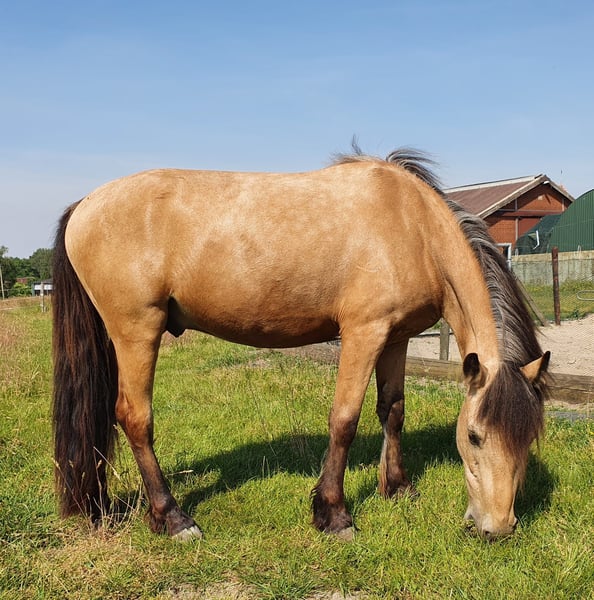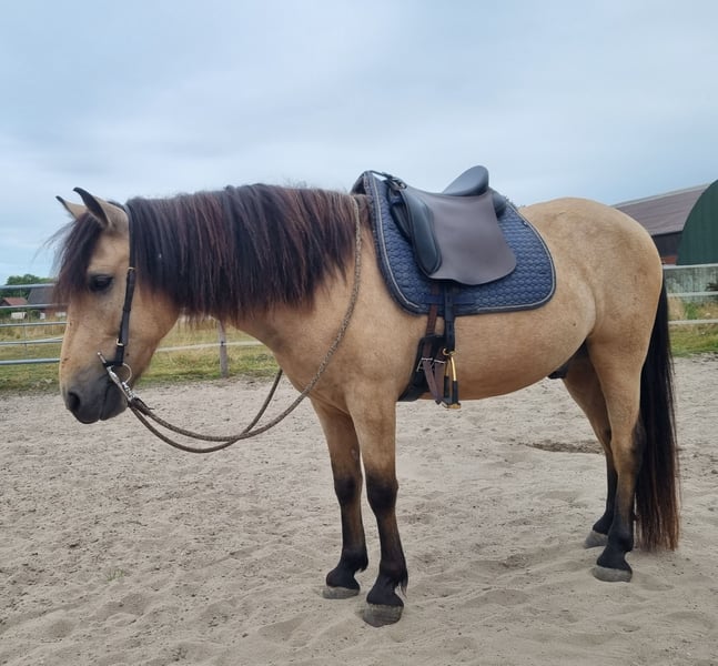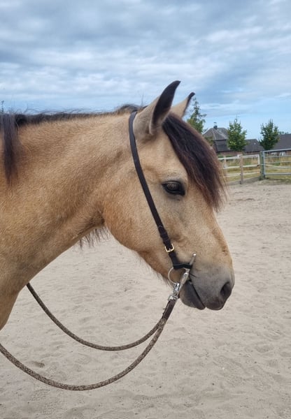 Amigo is 6 years old (born August 2019) and approximately 1.42 m tall. Since he is still a bit "babyish" and playful at the moment, he is not yet a pure children's pony. I could imagine a parent-child combination, a young rider with horse experience, or smaller adults being a good match for him. Guided riding or lunging with children he does calmly and relaxed. He has no experience with mounting, kicking, rearing, or bucking! In the arena, he is very calm to work with and remains unshaken by distractions. He is familiar with tractors, dogs, and playing children. He also walks over tarpaulins, allows himself to be tacked up with them, crosses bridges, and goes through water ditches – he is curious about all these things, very eager to learn, and deeply relaxed. I have worked with him extensively from the ground: he knows natural horsemanship, lunging, double lunge, basic groundwork with a side reins, and some handling work. He shows interest in free work and learns very quickly; he would probably also be suitable for someone interested in classical dressage or equine biomechanics. Currently, he walks and trots under saddle; in canter, he needs a rider who can help him maintain his balance, otherwise he tends to fall back into the trot. The first picture shows him in his summer coat, pictures 2 and 3 are from October. He is being sold only because he is unfortunately not the ideal partner for my mare.