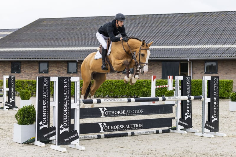 The six-year-old Jeroboam Van De Rib is a striking showjumping horse, not only because of his buckskin color. He also shows great scope and quality over the jumps and already has course experience at 1.20m level. We believe he will perform best with a professional or semi-professional rider. His sire, Eldorado van de Rib, is a pinto stallion who competed at international 1.40m level at the age of seven with Jeremy Le Roy (France). Calua du Werfat (Cambito van de Helle) also gave the 1.45m level horse D’Enfer van de Rib ridden by Sebastien Planchat (FRA), as well as the AES stallion Envol van de Rib (1.30m level). https://youhorse.auction/en/auction/Jeroboam-van-de-Rib-ELDORADO-VAN-DE-RIB-x-CAMBITO-VAN-DE-HELLE-5119