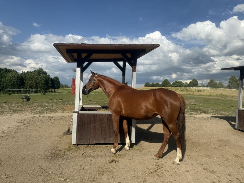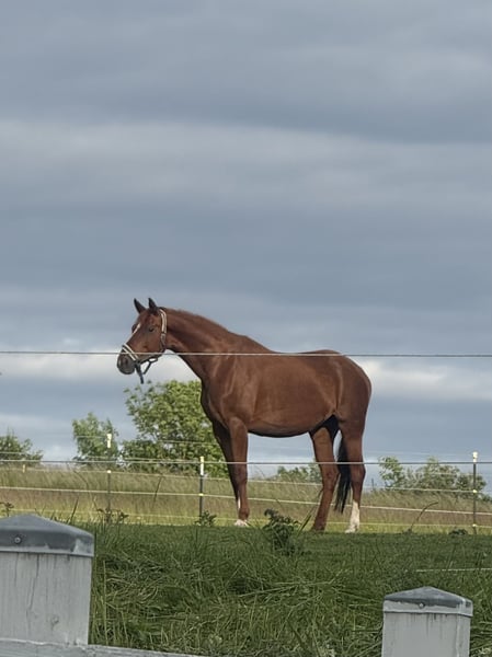 Esta yegua de color alazán muy elegante no ha tenido mucha experiencia en su vida. Fue montada por su anterior propietario a los cuatro años, pero desde entonces ha estado principalmente en su establo sin realizar mucho más. Es completamente sin desgaste y, sin embargo, claramente es un caballo en desarrollo. Necesita mucho tiempo para adaptarse a lo nuevo y a veces muestra inseguridad. Lamentablemente, no sabe mucho todavía. Ya hemos comenzado a trabajar con ella en la cuerda y también conoce el trabajo en el picadero de antes, aunque no he profundizado más en ello debido a falta de tiempo. Quiero venderla a manos muy buenas, ya que es un caballo muy cariñoso. Ella vive en un paddock y sería ideal que pudiera volver a estar en un grupo de caballos.