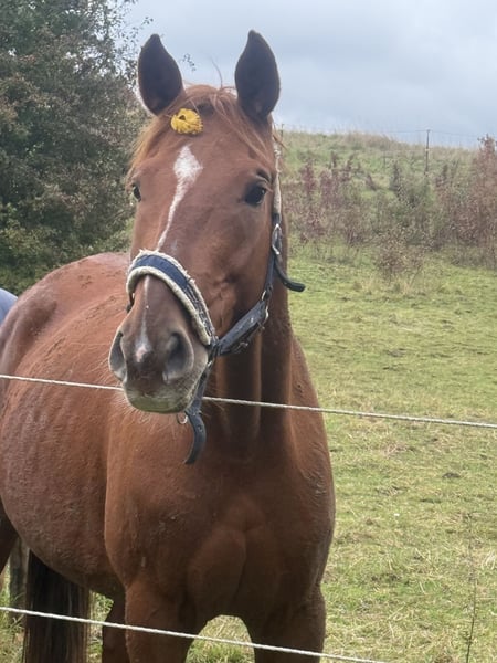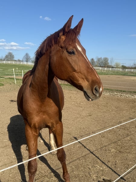 Diese sehr schicke Fuchsstute hat in ihrem Leben leider noch nicht sehr viel gemacht. Sie wurde beim Vorbesitzer vierjährig geritten, aber stand seitdem hauptsächlich auf seinem Hof rum und hat nichts weiter getan. Sie ist absolut unverbraucht, aber definitiv ein Projektpferd. Sie braucht viel Zeit, um sich auf Neues einzulassen und ist manchmal sehr unsicher. Sie kennt leider nicht sehr viel und stand ziemlich lange relativ isoliert mit einem anderen Pferd. Sie hat keine Abstammung geht laut Vorbesitzer aber auf Blaubart zurück. Da sich der Vorbesitzer nicht sicher war, welche seiner Stuten sie Mutter zu ihr ist, hat er es nicht eintragen lassen. Allerdings liegen alle Stuten die in Betracht kommen bis Klasse L im Springsport. Wir haben mit ihr bereits begonnen, Bodenarbeit zu machen und sie kennt auch von früher das longieren. Jedoch habe ich noch nicht weiter daran gearbeitet, weil mir die Zeit fehlt. Ich möchte Sie in sehr gute Hände verkaufen, weil sie ein sehr liebenswertes Pferd ist. Sie steht im Offenstall, und es wäre schön, wenn sie auch in selbigen wieder kommt. Sie ist entwurmt und komplett geimpft. Sie benötigt aufgrund des steinigen Bodens vorne Eisen. Dafür müssen wir sie zur Zeit noch sedieren. Auf den Hänger ging sie, als wir sie geholt haben mit einem anderen Pferd relativ problemlos und ist dann alleine gut gefahren.
