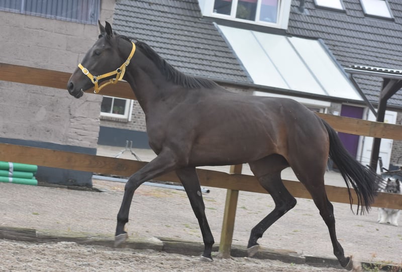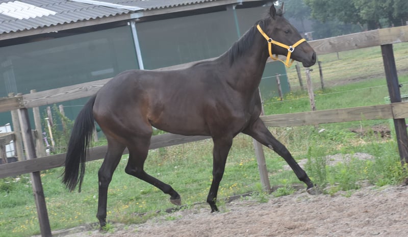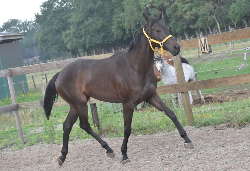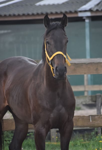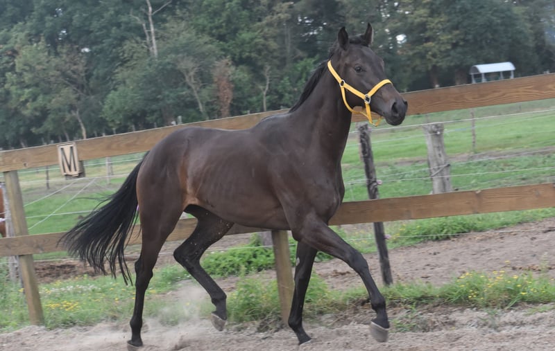 Meet Arya, a beautiful young mare with a pedigree of Vocalised x Laughing Matter. This charming lady immediately captures a place in your heart with her presence and character. Due to her full pedigree and fine character, she is also interesting for breeding. She stands at approximately 160 cm tall. Arya is incredibly well-behaved and level-headed here. Because she is young, you need to build up with her calmly and allow for plenty of rest, but you can start walking her right away. She is curious by nature and always comes to check on you in the pasture. A truly people-oriented horse! A reliable, willing mare with a golden character and future perspective as your best buddy. Not a movement wonder; at the moment, she is not entirely free on one side. Price: € 2450,-