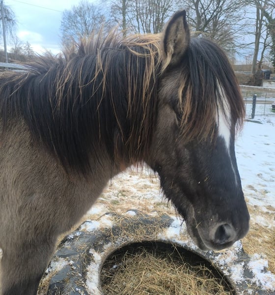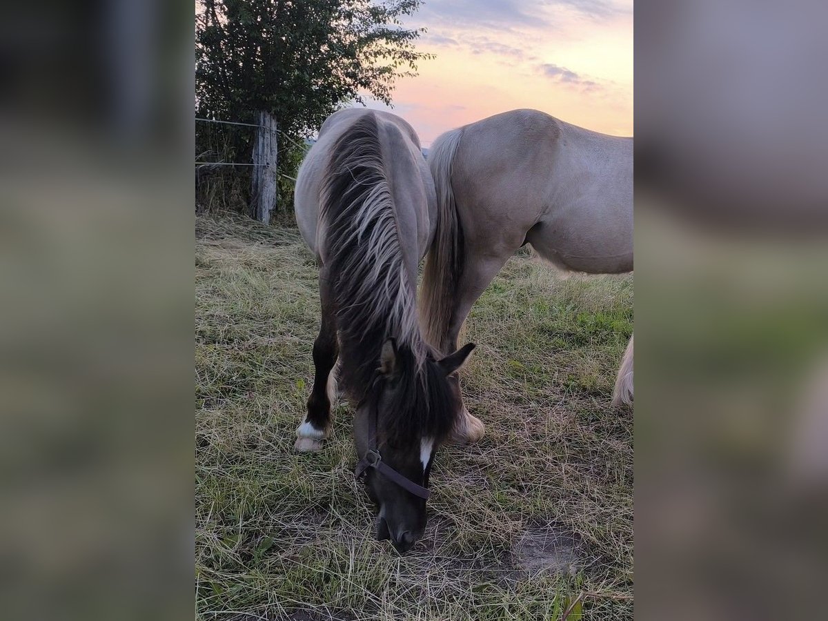 Grisu, a beautiful dark Grullo, is looking for a new owner. Born in May 2024, currently 1.37 m tall, with a powerful build behind and a height of approximately 1.45 m (possibly a bit more) in the Haffiform. Square and well-proportioned, compact, suitable for adult riders in the future. Elegant head, lovely neck crest, very good topline, two-tone mane and tail. His name is Grisu. His mother is a Tinker (1.45 m) crossed with a Konik (147 cm). He is healthy and robust, with excellent hooves. He is used to being turned out alone, remains calm on his own, and is familiar with loading and trailer driving. Very manageable for children and beginners, totally cool and fearless, human-oriented, and learns very quickly. He already knows a lot, including desensitization training, walking in the terrain and on the road. He is gentle when being farriered and comes to call in the herd. There is a possibility that he might be gelded by our veterinarian. Currently, he is housed in a large box with his buddy and is also kept among our mares in the stable. He is a reliable pony suitable for riding and driving. Additionally, he is in one of the most beautiful rare colors, Grullo / Mouse Dun, with zebra stripes on his legs, black-rimmed ears, and a dark dorsal stripe. Photos from foal age included; more recent pictures to follow.