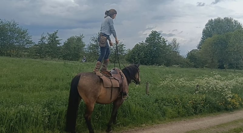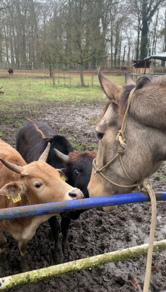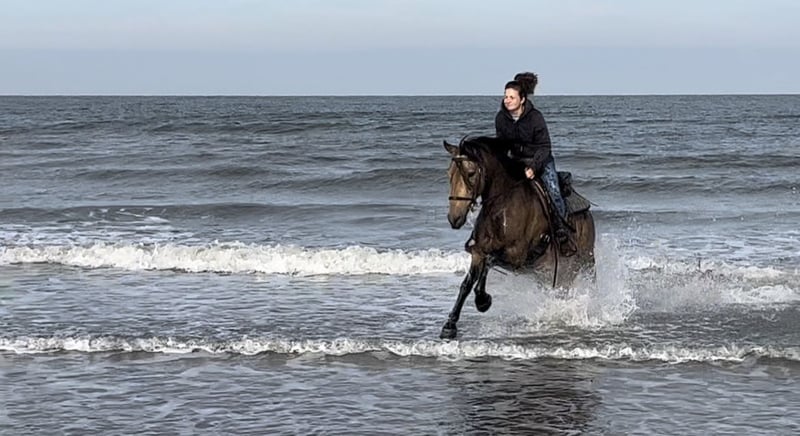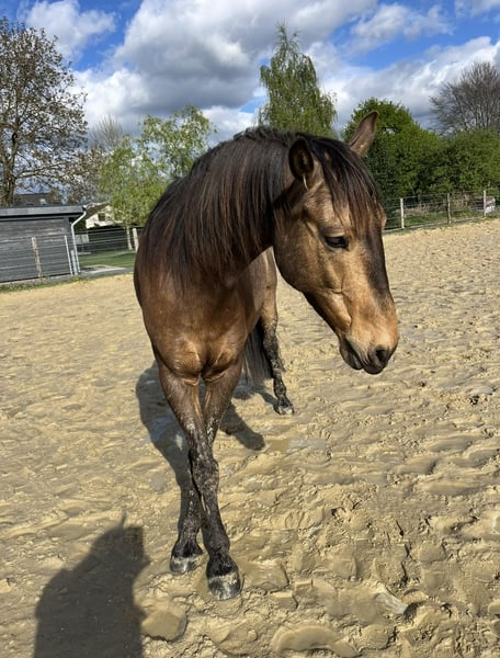 Met pijn in het hart moet ik mijn zielsgenoot verkopen. Omdat hij alleen in de allerbeste handen terechtkomt, vraag ik je het bericht zorgvuldig te lezen en alleen te reageren als je oprecht geïnteresseerd bent om hem als familielid, partner en vriend in je leven op te nemen. Turrón is een import-Spaanse (Conjunto Mestizo), in de prachtige kleur "Bayo", en staat inmiddels 5 jaar aan mijn zijde. Hij is over het algemeen zeer mensgericht. Hij bouwt echter vooral een sterke, bijzondere band op met zijn eigenaar en is daarom geen "familiepaard" of paard voor wisselende ruiters. Van karakter is hij gevoelig, speels, knuffelbaar, intelligent, dominant, nieuwsgierig en relaxed. Hij kan zeer fijn zijn in lichaamstaal, stemcommando’s en ruiterhulpen, maar probeert soms ook zijn eigen wil door te zetten. Daarom is een rustige, liefdevolle, consequente, zelfverzekerde en faire eigenaar belangrijk. Turrón houdt van afwisselende activiteiten. Hij geniet van grondwerk, equikinetiek, cirkeltraining, cavaletti, wandelingen, buitenritten enzovoort. Hij is een “coole peer” en voelt zich zowel alleen als in het gezelschap van andere paarden zeer op zijn gemak in het terrein. Hij wordt gereden in western vrijetijdsrijden, maar heeft ook ervaring opgedaan met handwerk en klassieke dressuur bij een instructrice (zijgangen, recentelijk ook renvers en travers in stap en draf, verlengen van passen in draf, halve passen op weg naar piaffe, en begonnen met de Spaanse stap onder het zadel) -> https://jennifer-pecat.de. Vanwege zijn ras is hij laat aangezet en met veel geduld getraind. Hij is zeer herdverträglich, heeft eerder met merries gestaan, maar voor zijn zenuwstelsel is een herde met alleen hengsten het beste. Sinds oktober woont hij in een privé openstal in Oberkrüchten, en ik zou het liefst willen dat hij daar kan blijven, omdat hij zich duidelijk thuis voelt. Het is een kleine, stabiele groep die hem veiligheid en rust biedt, en voorzien in zijn speels- en knuffelbehoefte. Een 6-sterren deluxe VP-stal – ook voor de mens. Voor hem zijn beweging en rustruimte belangrijk, net als de beperkte weidegang (2 uur per dag, bij zeer langzame inloop). Vanwege zijn afkomst kan hij slechts weinig gras eten en wordt hij volgens zijn mediterraanse stofwisseling gevoerd. Turrón loopt op blote voeten. Helaas is hij allergisch voor stro en pollen (hij krijgt momenteel loratadine tijdens het pollenseizoen). Tot nu toe hebben we geluk gehad – geen koliek, ernstige blessures of andere problemen. Hij is regelmatig gevaccineerd (tetanus, influenza) en ontwormd. Zijn tanden laat hij zelfs zonder sedatie braaf behandelen. Hij gaat probleemloos in de trailer en blijft tijdens het vervoer rustig. Turrón wordt inclusief toebehoren verkocht. Dit is van hoge kwaliteit (Rieser, Signum, Hilburry, etc.) en wordt met €1500 extra berekend. Een keuring (AKU) kan uiteraard door de geïnteresseerde bij een dierenarts naar keuze op locatie worden laten uitvoeren; de kosten hiervoor zijn voor rekening van de koper. Proefritten kosten €40, deze worden bij aankoop verrekend met de koopprijs. *Alle informatie is naar beste weten gegeven, aangezien het om een levend wezen gaat, zonder garantie.*