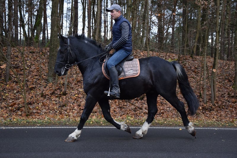 This stunning, jet-black draft horse cross (sire: draft horse, dam: warmblood) gelding was born in 2021 and currently measures 15.7 hh. He impresses with his correct conformation, elegant appearance, and especially his very sweet temperament. He is very affectionate, friendly, playful, and open-minded towards people. Despite his young age, he is already surprisingly calm and well-behaved in handling — whether at the vet or the farrier. He has been regularly dewormed, has a passport, and is familiar with various types of turnout, including box stabling with pasture turnout and herd life. He is still developing age-appropriately but has already been ridden playfully and with patience. Under saddle, he is eager to learn, attentive, and versatile. Grot is very comfortable and easy to sit. He learns quickly and is focused on work. He is also easy to load and farrier-friendly. More information available via WhatsApp: +48 784 738 028 Location: 86-200 Chelmno, Poland — a more affordable option possible. Additional pictures and video can be found on our website: http://horseforsalepoland.weebly.com/grot.html