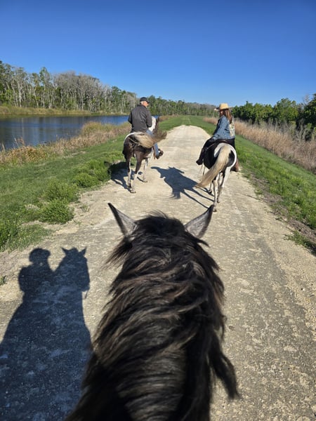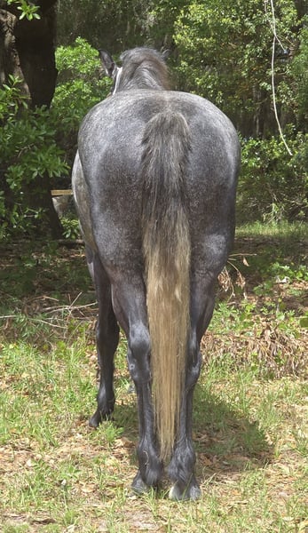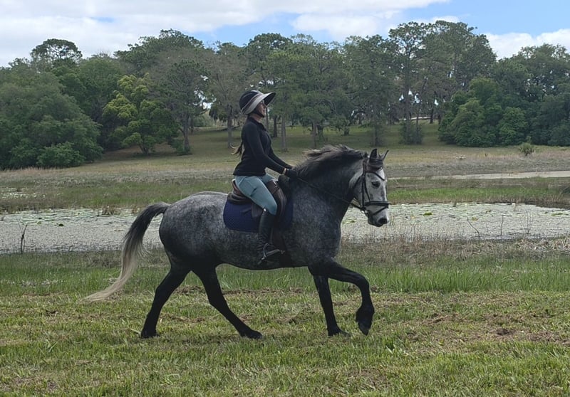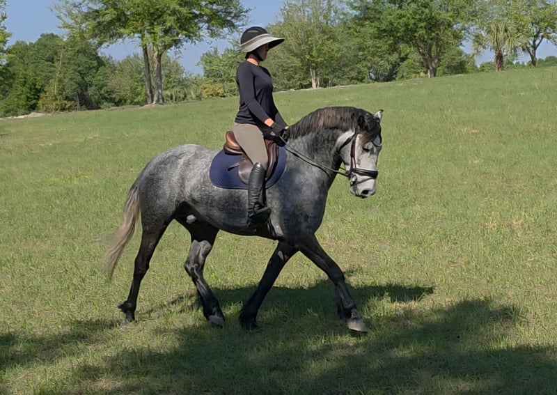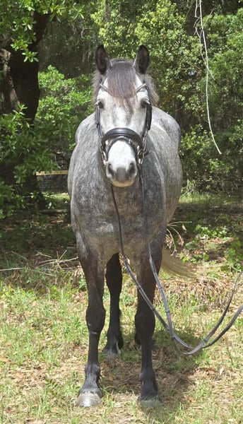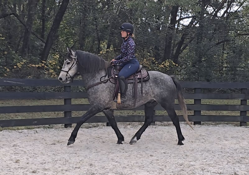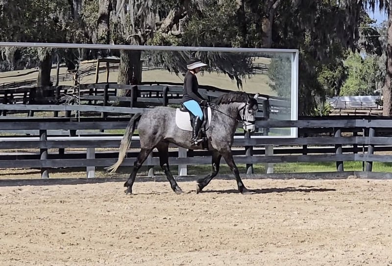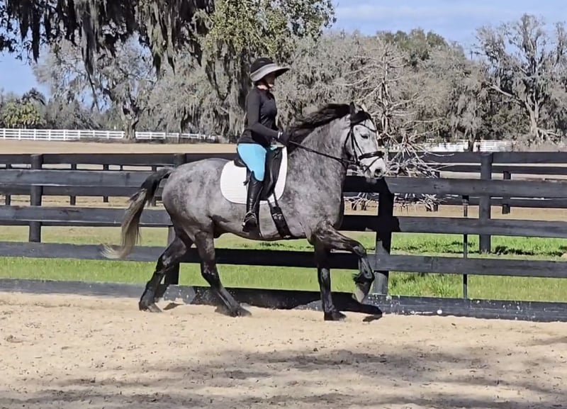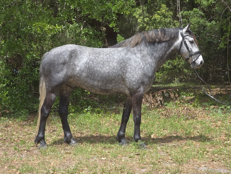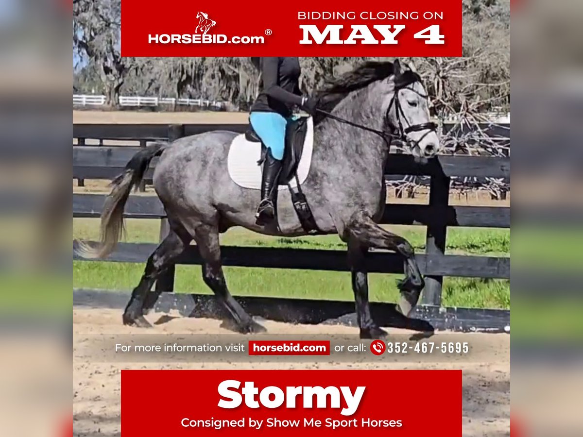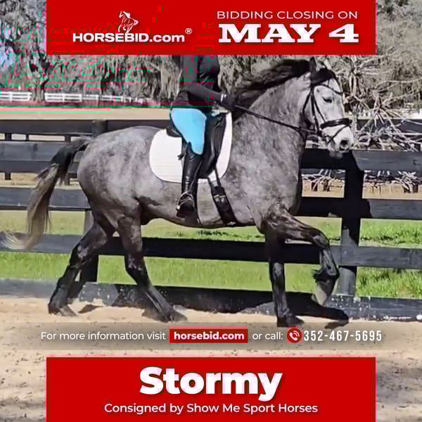 ▪️▫️◾️𝐭𝐡𝐞 𝑴𝒂𝒚 𝐒𝐞𝐥𝐞𝐜𝐭◾️▫️▪️ Happening now thru MONDAY | MAY 4th - Available EXCLUSIVELY on HorseBid's website! For more details and to register visit: www.Horsebid.com CONSIGNOR CONTACT: Show Me Sport Horses 352-467-5695 LOCATION: Weirsdale, FL BREED: Warmblood x Draft Cross REGISTERED: Yes REGISTERED NAME: Stormy COLOR: Dappled Grey HEIGHT: 15.3 AGE: 5 GENDER: Gelding Stormy is a gorgeous 5yr 15.3h dappled grey gelding. He is a unique cross - Andalusian x Friesian x Knabstrupper x Percheron. He is microchipped and registered with American Warmblood Registry, eligible for breed awards. We purchased Stormy directly from the breeder Big Sexy Stables, so his entire history is known and he has always been healthy and sound. Since our new property has been under constant construction, the majority of Stormy's training has been outside of the arena. He has been exposed to a lot in training and has exceeded our expectations - riding around bonfires, hundreds of trees being knocked over, fence post pounders, well drilling rigs, excavators, loose dogs, etc. With no arena to ride in yet, Stormy has logged hundreds of miles on the trails riding alone and with groups of all sizes. He will lead or follow and go through the trappiest of terrain including mucky swamps and palm forests so thick you can't see 2ft in front of you. He grew up around cattle and doesn’t mind wildlife out on the trail. Stormy loves water and is always up for a swim. He has been hauled off-site many times for trail riding and dressage lessons. Stormy is a gem! He has a playful puppydog temperament and a great work ethic. Very smart and trainable. Loves to ride and spend time with his person. Stormy rides english and western. He has been nicely started on the flat and has just been introduced to jumping. He is the uphill athletic type with a smooth trot and super comfortable canter. He is perfectly forward, light in the bridle, and rides off of the seat and leg. With his athleticism and solid foundation, Stormy would excel in working equitation, eventing, fox hunting, trail competition, or dressage. He has a nice stop, a smooth backup, and is well-started laterally— leg yielding, shoulder fore, side passing, and turning on the haunches. He will walk to canter, counter canter, and does simple changes. He is the same horse every day, no matter if you go on vacation and let him sit for a week or two. Perfect gentleman for the vet and farrier. Easy to catch, tie, bathe, clip, etc. Has always been sound with beautiful barefoot hooves. He lives out in a mixed herd and gets along with all of the horses. Stormy is located in Weirsdale, Florida near Ocala. Shipping can be arranged anywhere in the country. Please call Rachel with Show Me Sport Horses at 352-467-5695 with any questions.