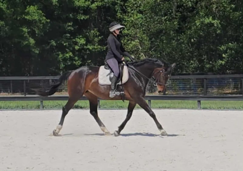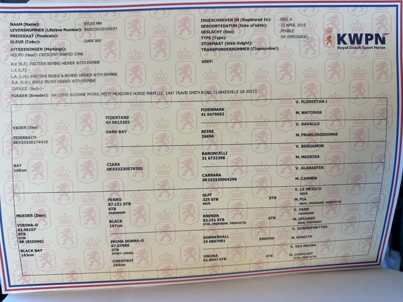 ONLINE VEILING Plaats uw biedingen op www.PlatinumEquineAuction.com Startbod $3500 Veiling eindigt op 8 juni 2025 Heeft u een nieuw zadel nodig? Bekijk White Rock Saddles op onze website of Facebook! Kylee is een 2015 16.2h KWPN geregistreerde Nederlandse Warmbloed merrie. Haar indrukwekkende bloedlijnen omvatten de beroemde hengsten Fiderbach, Ferro en Donnerhall. Kylee heeft meerdere jaren professionele dressuurtraining gehad. Ze traint op 2e niveau en heeft het talent om verder omhoog te gaan in de niveaus. Ze heeft het beste laterale werk en haar draf is soepel en gemakkelijk te zitten. Ze zou een leuke kandidaat kunnen zijn voor eventing of jagen. Kylee heeft vroeger op een fox hunting landgoed in de wei gestaan en is gewend aan de honden, jachthoorns, enzovoort. Ze is gemakkelijk in de omgang en is altijd onbevangen geweest zonder onderhoud. Ze rijdt in een zachte trens. Kylee is gemakkelijk te vangen, kruis te binden, te verzorgen, op te zadelen en te wassen. Ze probeert zelfs zelf het hoofdstel op te doen. Ze laadt mooi en is rustig tijdens het transport. Kylee staat samen met een ruin en deelt een omheining met een mini paard, een ezel en fokmerries. Als u droomt van een prachtige Warmbloed om te rijden of te fokken, mis dan niet de kans om deze prachtige Nederlandse Warmbloed te verwerven! Ze bevindt zich in Ocala, Florida met verzendmogelijkheden. Als u vragen heeft, bel dan Rachel van Show Me Sport Horses op 352-467-5695. ONLINE VEILING Plaats uw biedingen op www.PlatinumEquineAuction.com Startbod $3500 Veiling eindigt op 8 juni 2025 Heeft u een nieuw zadel nodig? Bekijk White Rock Saddles op onze website of Facebook!