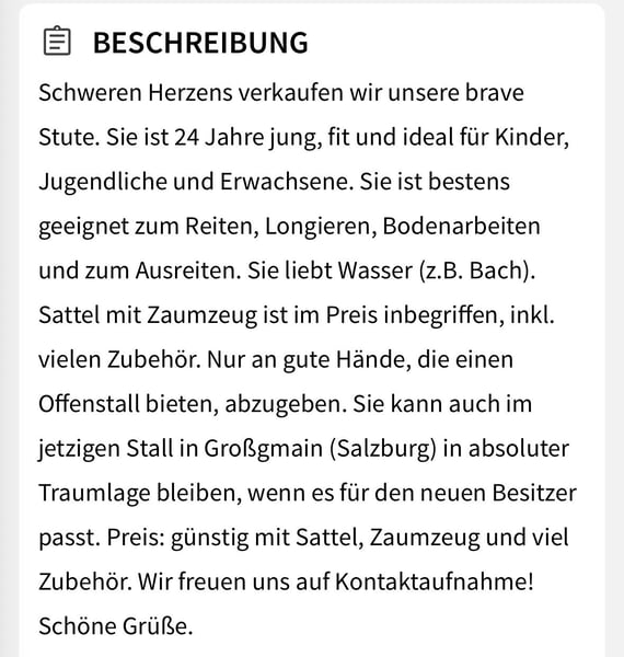 Schweren Herzens verkaufen wir unsere brave schöne Warmblut-Stute. Sie ist 24 Jahre jung, fit sehr brav, und für Kinder, Jugendliche und Erwachsene besonders geeignet. Nadi ist ein tolles Freizeit-Pferd zum reiten, longieren, bodenarbeiten…. sie ist sehr lernwillig und brav beim ausreiten. Sie scheut kein Gewässer (zB. Bach). Sie steht in einem tollen Offen-Aktiv-Stall mit Traumlage und soll am Besten wenn möglich dort bleiben, da es ihr dort sehr gut geht. Voraussetzung ist, dass sie in einen Offen-Stall kommt. Der Preis ist sehr günstig mit viel Zubehör und komplettem Sattelzeug. Wir freuen uns auf deine Kontaktaufnahme! Nur in beste Hände abzugeben! Schöne Grüße