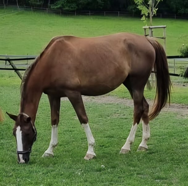 Duża, masywna klacz hodowlana w wieku 8 lat, po For Pleasure, z matki landjonker. W ciąży z Baloutaire PS.