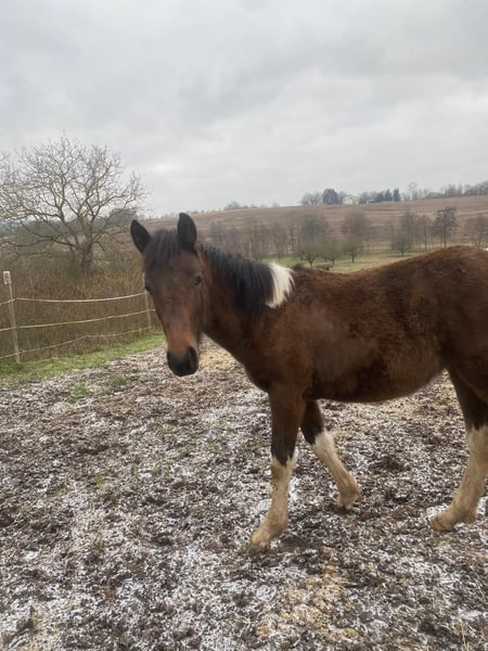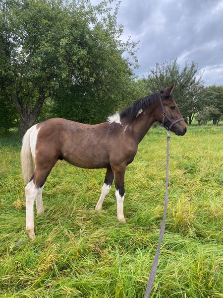 Ich verkaufe hier meinen 8 Monaten alten Hengst geb. am 29.03.25 Dakota hat ein unerschrockener und neugierigen Charakter er meistert das Fohlen abc kennt hufschmied Autos hunde und alleine spazieren gehen Er hat einen aktuellen stockmaß von 1,40 leider sind die rassen der Eltern unbekannt (Vater schecke Stockmaß 160 Mutter 155) und er lebt bei uns in einem offenstell bei weiteren Fragen gerne unter 017675823008